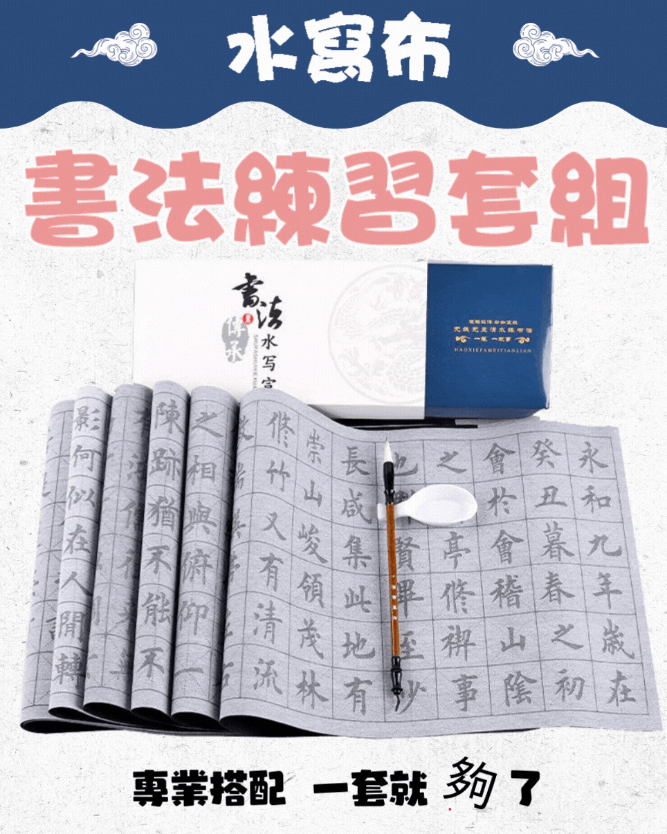臨摹水寫布套裝(12張水寫布+1只毛筆+水碟) 零門檻輕鬆練字 以水代墨重複練習 傳承經典!乾淨實用,萬次書寫,真正的享受練習書法的過程