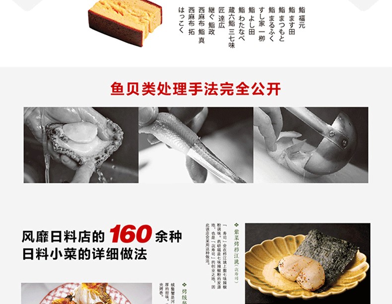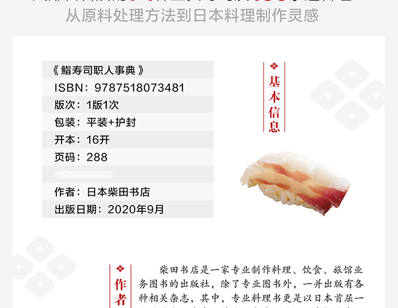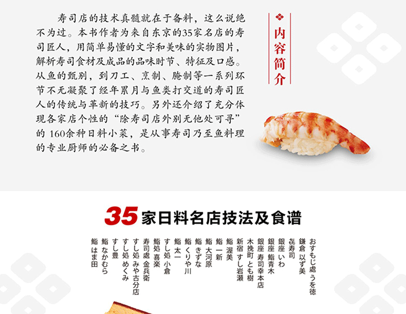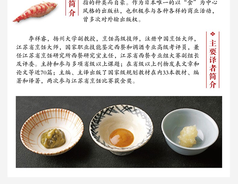 壽司的製作在日料中是一個永恆的話題,常常能引起廣大食客的期待,本書中有35位壽司職人,或為大師,或為新銳,他們精心研製出的74種風格各異的魚貝壽司和160餘道日本料理,展示了日本壽司和料理的魅力,值得大家品嚐、學習和製作。書稿中保留了零星的日文,是日本壽司店的名稱,但不影響讀者閱讀和參考。本書稿由揚州大學旅遊烹飪學院李祥睿、南開大學外國語學院陳玉婷、揚州大學外國語學院梁晨翻譯,參與譯文資料蒐集、文字校對的有陳洪華、周倩、李佳琪、許志誠、徐子昂等。