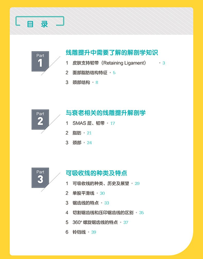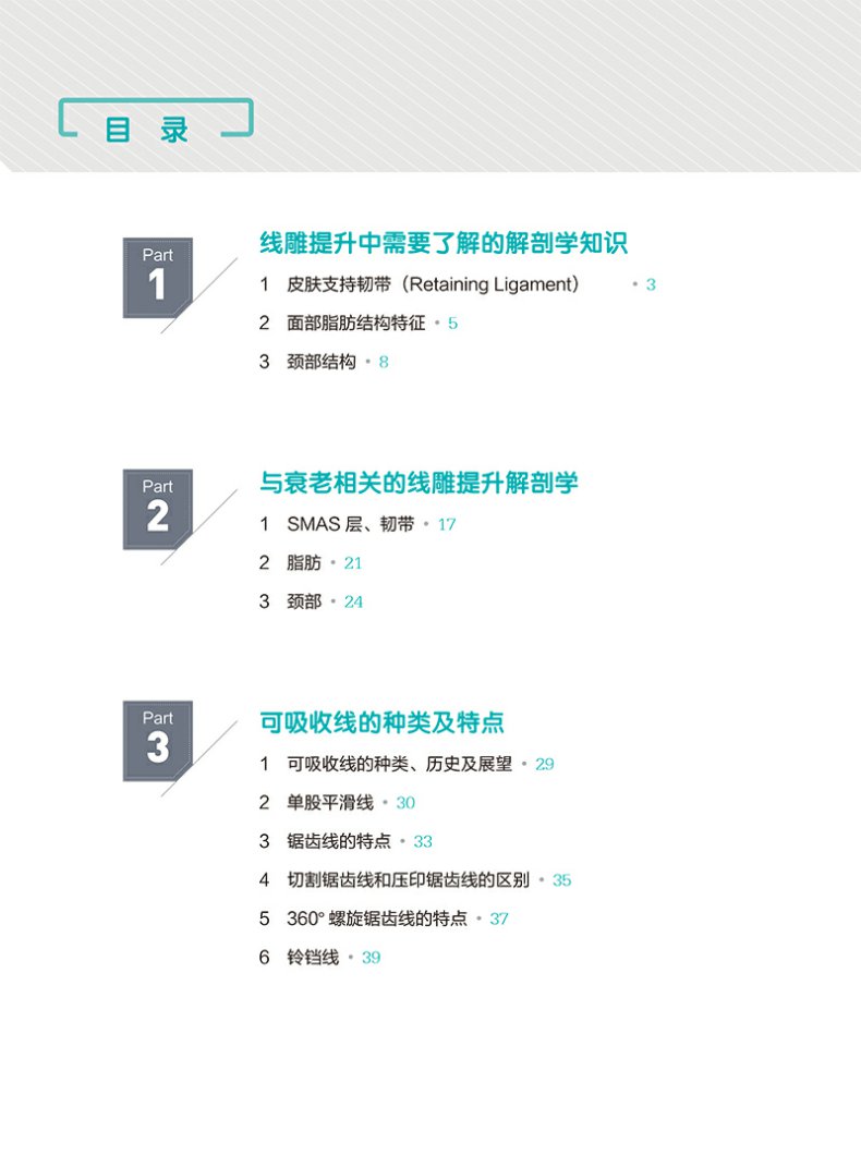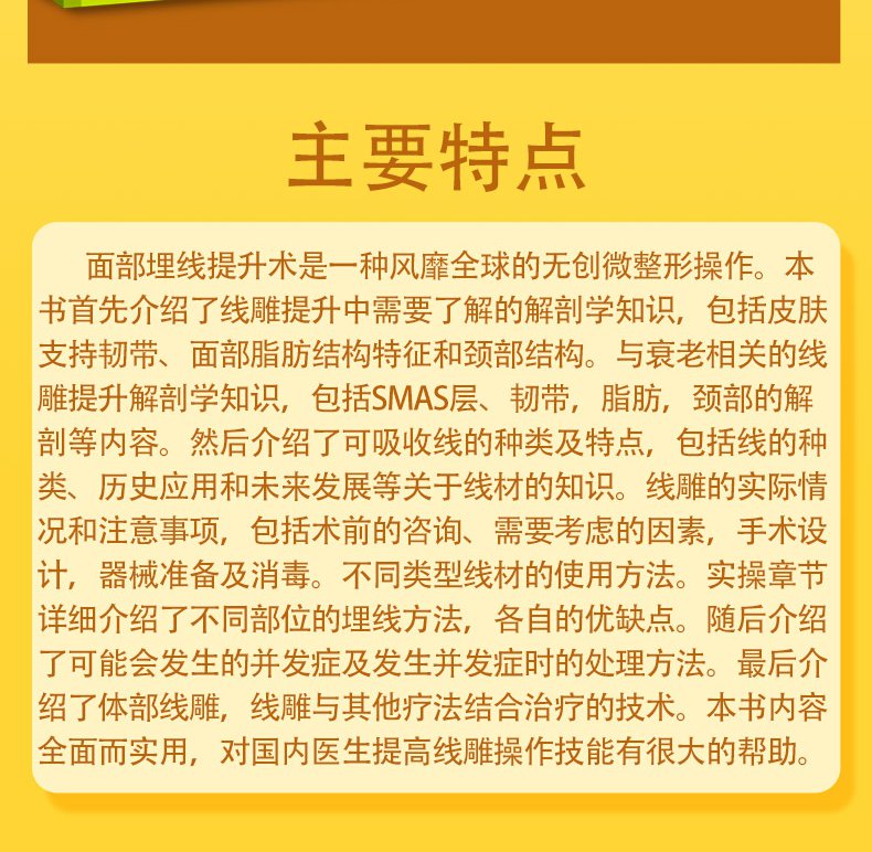 臉部埋線提升術是一種風靡全球的非侵入性微整形操作。本書首先介紹了線雕提升中需要了解的解剖學知識,包括皮膚支持韌帶、臉部脂肪結構特徵和頸部結構。與老化相關的線雕提升解剖學知識,包括SMAS層、韌帶,脂肪,頸部的解剖等內容。接著介紹了可吸收線的種類及特點,包括線的種類、歷史應用和未來發展等關於線材的知識。線雕的實際狀況及注意事項,包括術前的諮詢、需要考慮的因素,手術設計,器械準備消毒。不同類型線材的使用方法。實操章節詳細介紹了不同部位的埋線方法,各自的優缺點。隨後介紹了可能會發生的併發症及發生併發症時的處理方法。最後介紹了體部線雕,線雕與其他療法結合治療的技術。本書內容全面實用,對國內醫師提升線雕操作技能有很大的幫助。