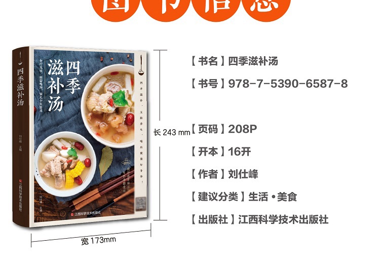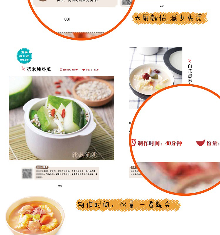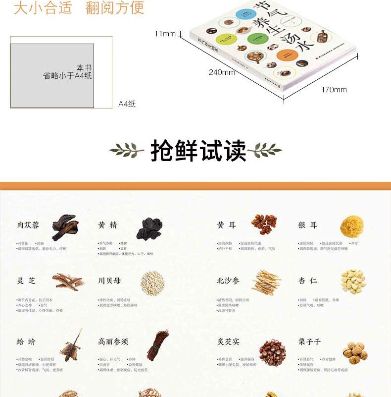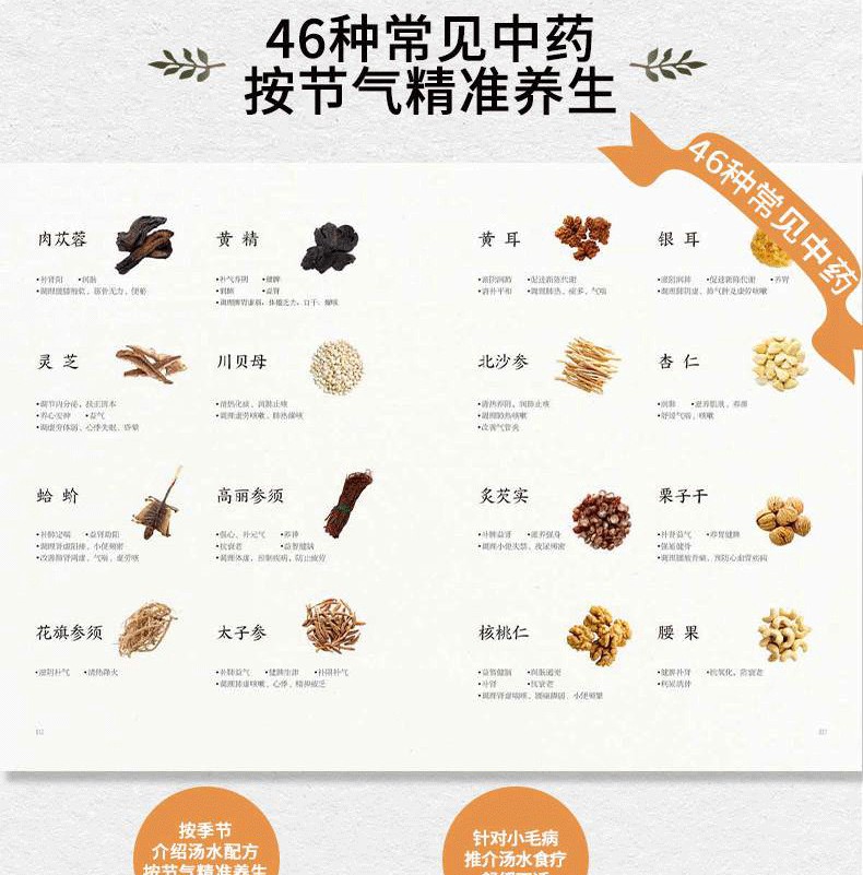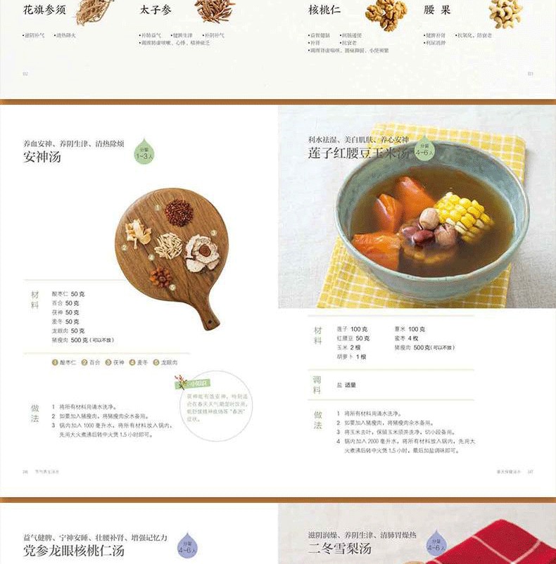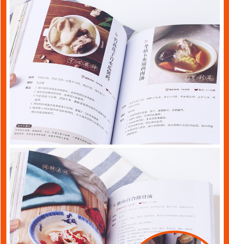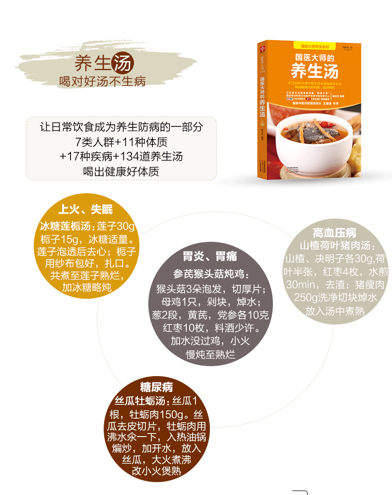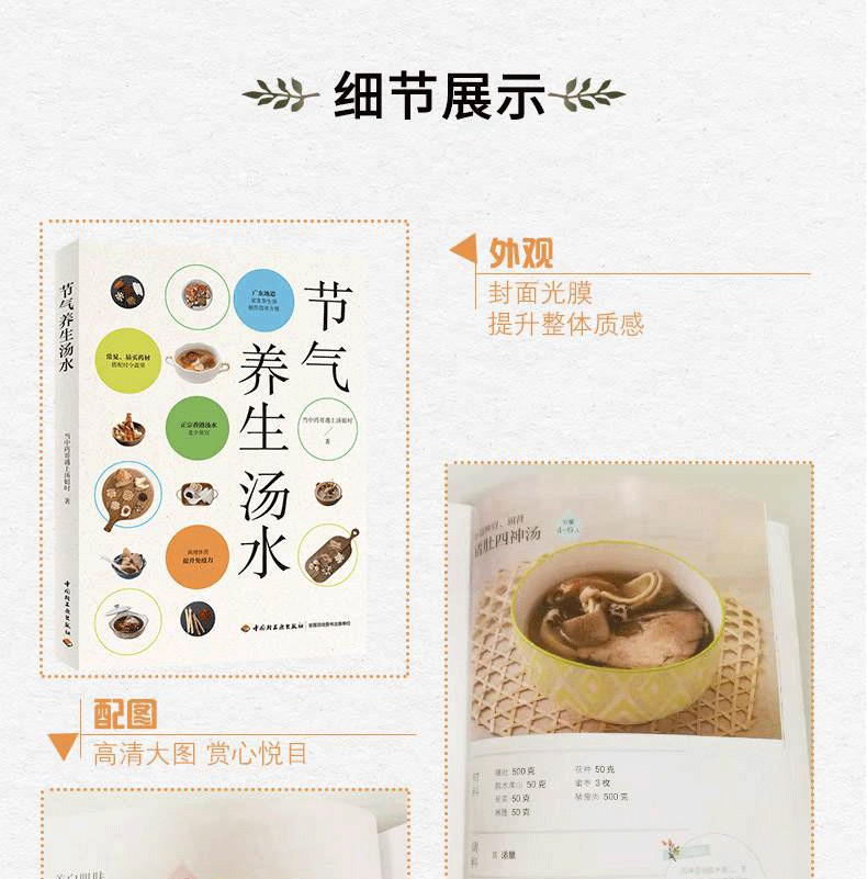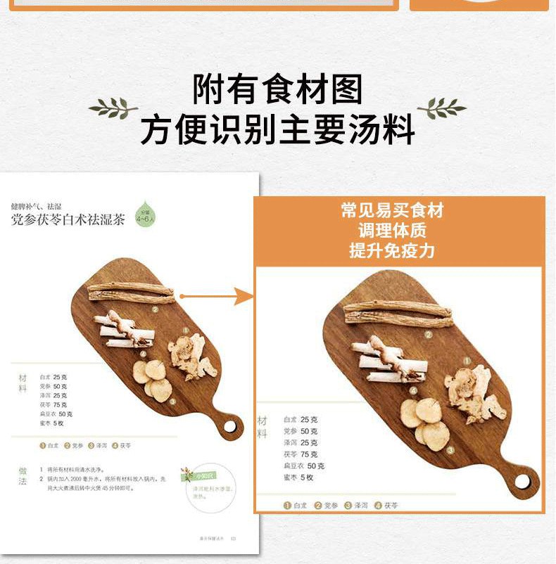 書中所提供湯膳,大都是家常湯,根據不同季節、不同人群、不同體質和各種疾病情況,適當加入了相應的中藥,以起到祛病防病的效果。湯膳中加入的中藥都是藥食兩用之品,取量精當,煲出的湯溫和中庸,無論是養生滋補,還是祛病防病,都可經常食用。