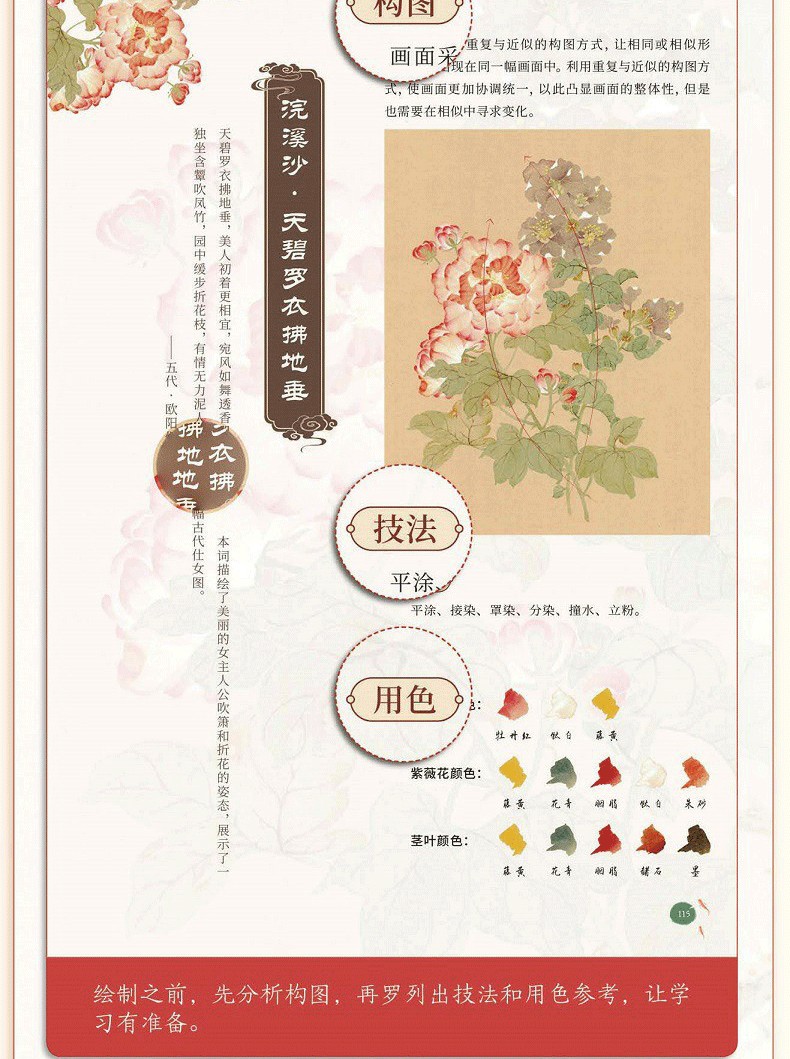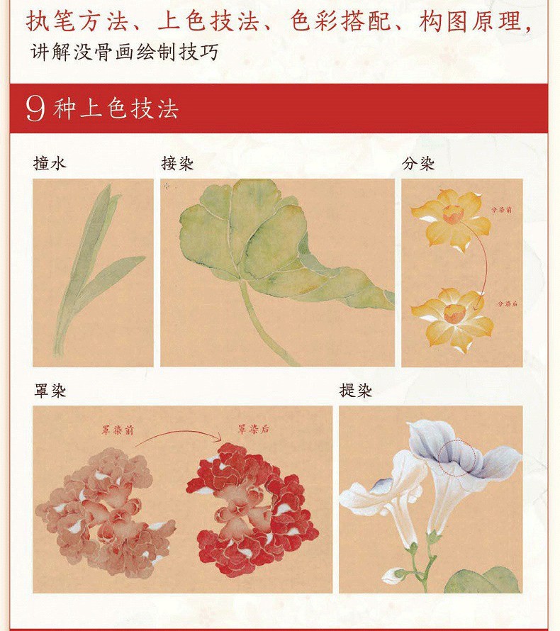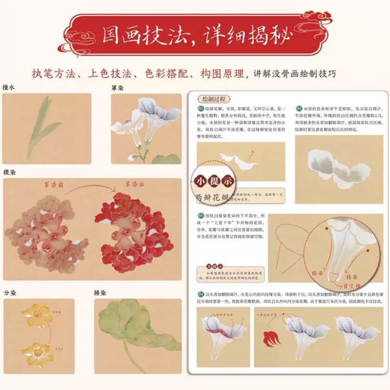 本書分為「含露團雪」「芳草萋萋」「情紅滿枝」「草粘飛蝶」4章。書中每個案例都涉及構圖、技法、用色、繪製過程等多個面向的內容,體現了對繪畫的思考與總結,帶領讀者感受到沒骨畫的筆墨神韻。