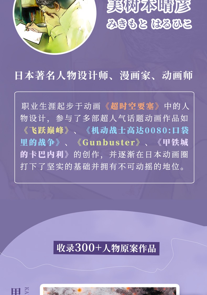 本書詳細介紹了美樹本晴彥的創作歷程,從《城堡內的廢墟》到《機動戰士高達0080:口袋裡的戰爭》《GunBuster》《機動戰士鋼彈:閃光的哈薩維》等。書中也收錄了美樹本晴彥對一些人物設計的註解,可以幫助讀者更好地理解他的設計過程。