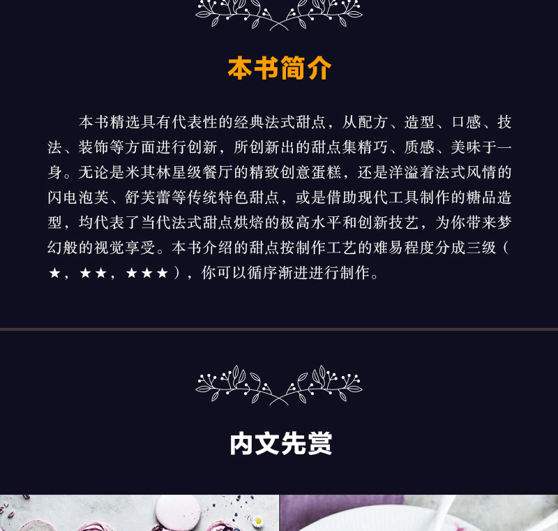 《味覺與視覺的華麗盛宴 法式盤飾甜點》是從日本河出書房新社引進的一本美食書,介紹了各種盤飾甜點的製作。本書介紹了26種美味盤飾甜點,每種盤飾甜點都是由多種小甜點組合而成的,包括蛋糕、慕斯、水果、冰淇淋、果醬、奶油、巧克力、花草等,各種小甜點擺放考究,美觀誘人。每種小甜點都有詳細的材料和做法,圖片清晰,製作簡單。