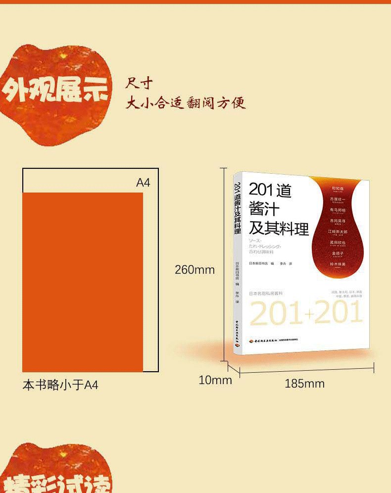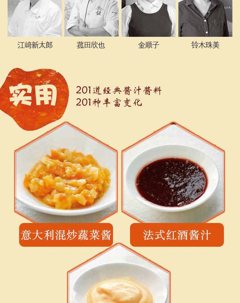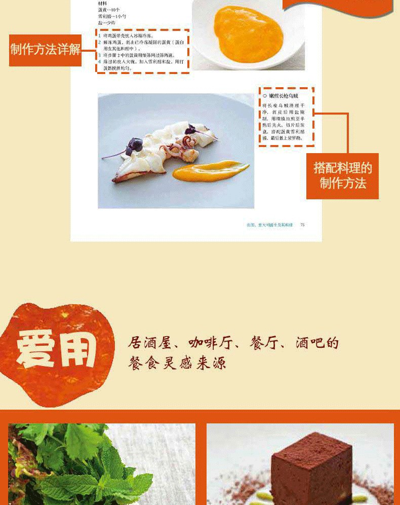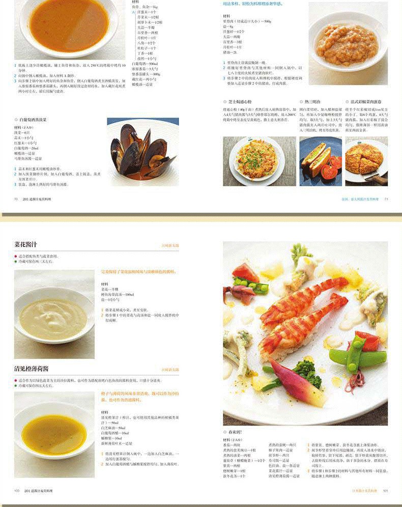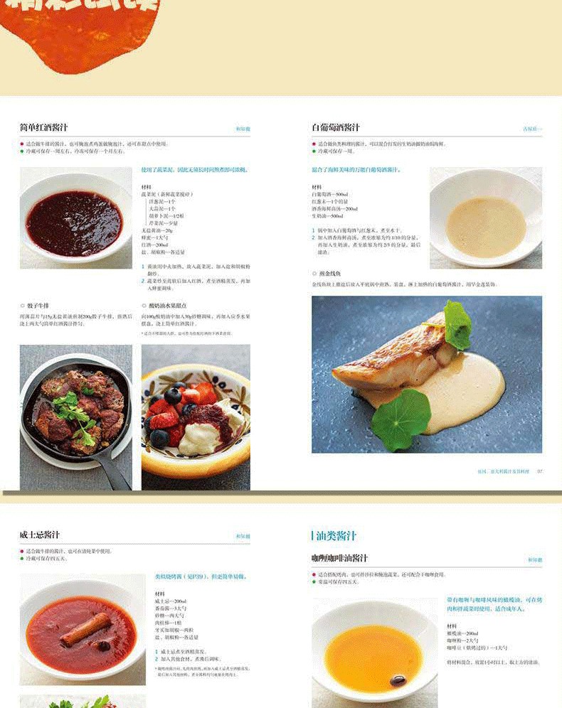 201種醬料調配,根據各國料理特點,按照材料和調製方法清晰分類,方便查找。與書中醬汁完美搭配的201種菜品,製作步驟清楚,是餐廳製作醬汁料理的絕佳參考。