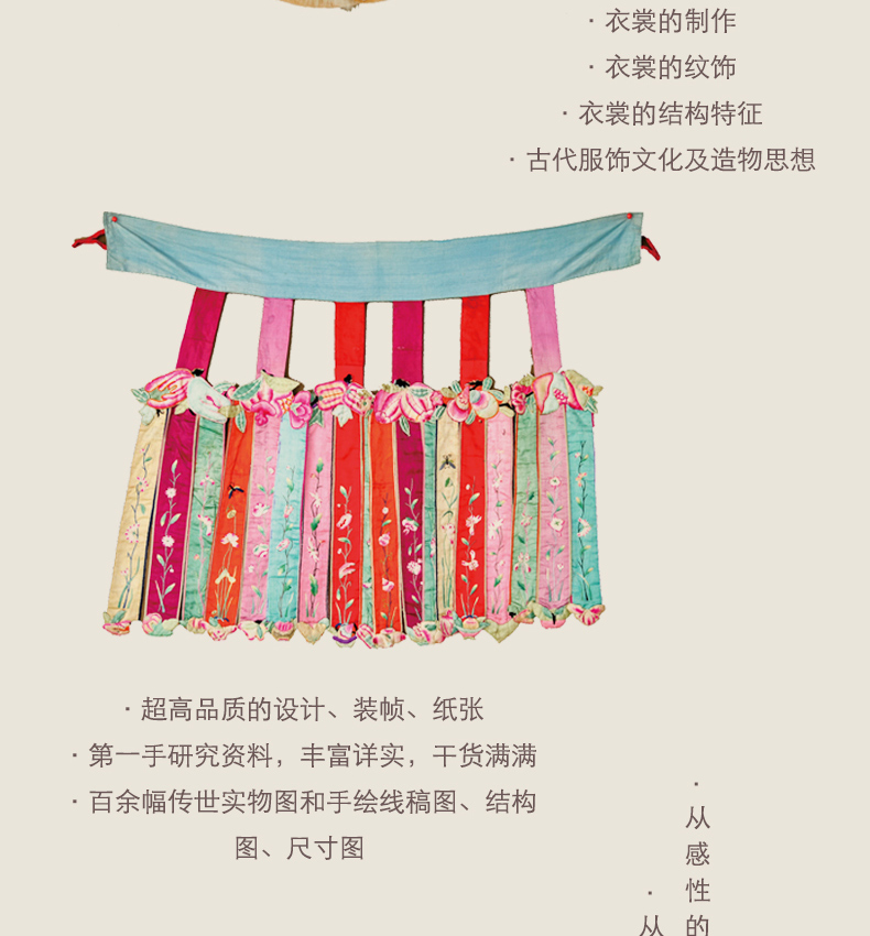 面對“寫在身上的歷史”——漢族民間服裝,作者堅持以虔誠的態度與求實求證的工作宗旨,廣泛研習傳統紡織印染技法、服裝製作技藝、裝飾工藝、民俗內涵等,注重對於造型、紋樣、配飾等設計藝術理論與實踐的探索,並將其與服裝所蘊涵的歷史、社會、心理、美學等文化內涵交叉融合,選取代表性物質文化遺產與非物質文化遺產中的上衣下裳、足服、荷包以及織造、印染、製作、裝飾等技藝,構建而成“漢族民間服飾譜系”叢書,以期能夠展現豐富多彩的漢民族服飾藝術與深厚的民族服飾思想。