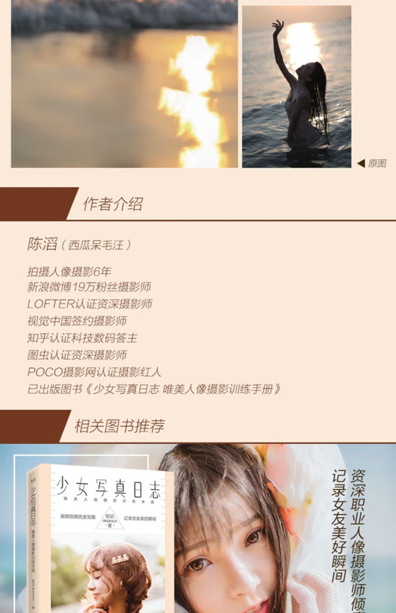 "1資深人像攝影師陳韜(西瓜呆毛汪)繼暢銷圖書《少女寫真日誌》之後攝影教程力作! 2知名人像模特櫻桃喵全程參與,全書出鏡! 3全彩印刷,無光銅紙張,近300頁超多乾貨內容! 4私房攝影、少女寫真,室內、戶外、各種場景各種風格一網打盡! "