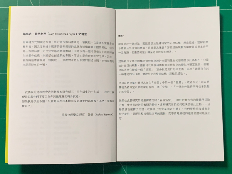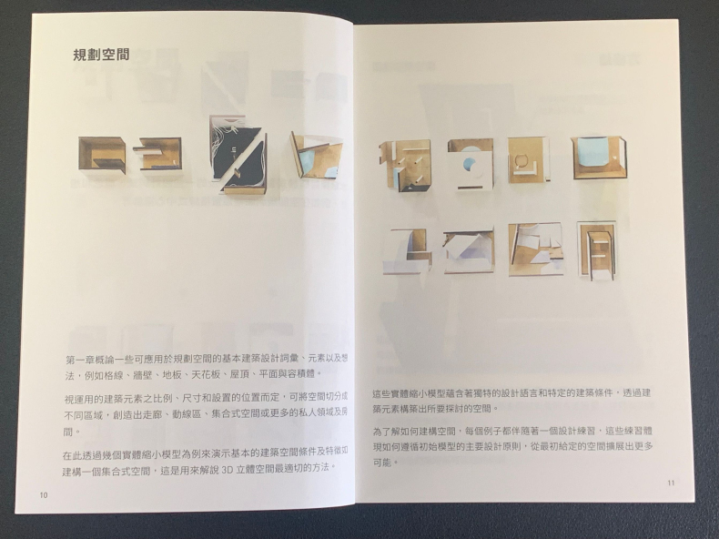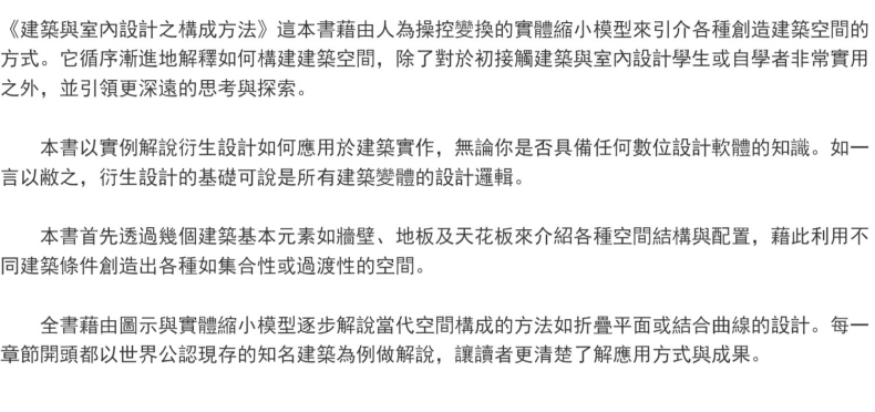這本書藉由人為操控變換的實體縮小模型來引導各種創造建築空間的方式。它循序漸進地解釋如何構建建築空間,除了對於初接觸建築與室內設計學生或自學者非常實用之外,並引領更深遠的思考和探索。