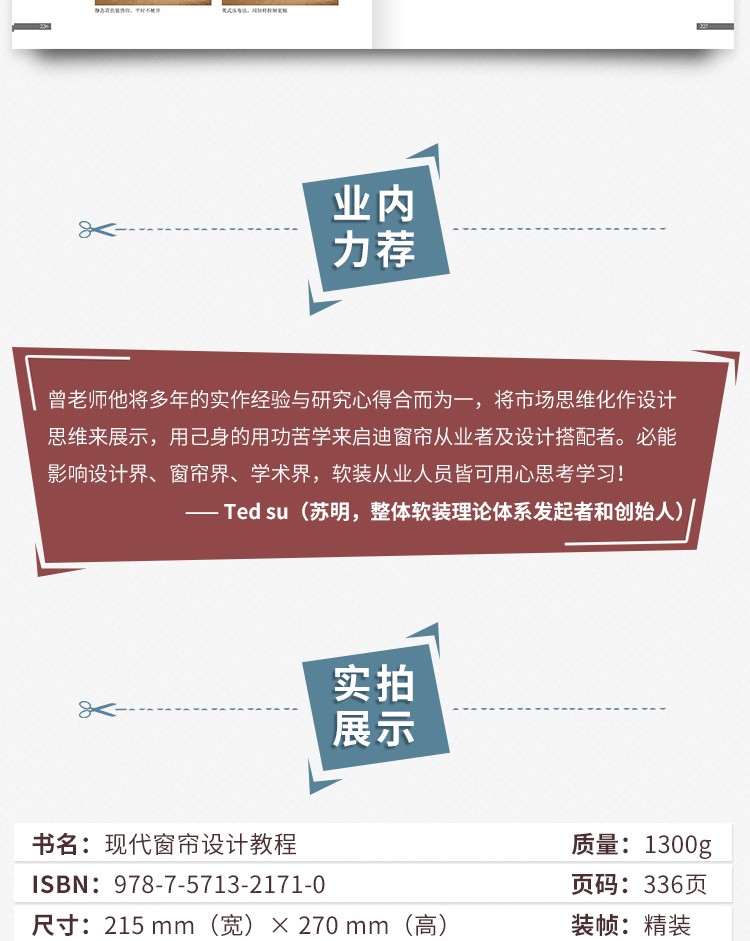 《窗飾設計方案》不僅提供了一份具有啟迪性的可視目錄,使人富有想像地去運用褶形布簾、百葉窗簾、遮陽簾和百葉窗,而且還對細節進行了探究;它提供了各種產品的重要信息、利弊得失,告訴你如何選擇織物、處理織物,使其在任意房間都能營造出恰當的氛圍。
