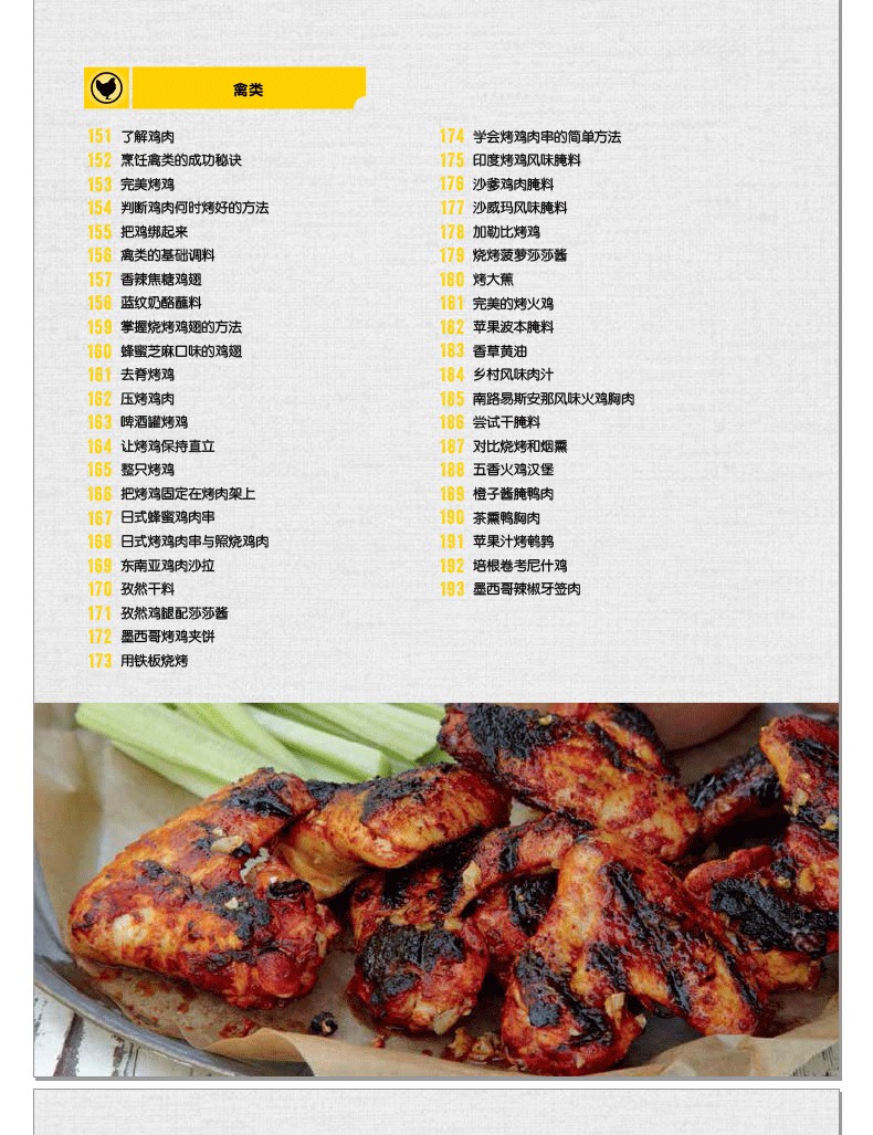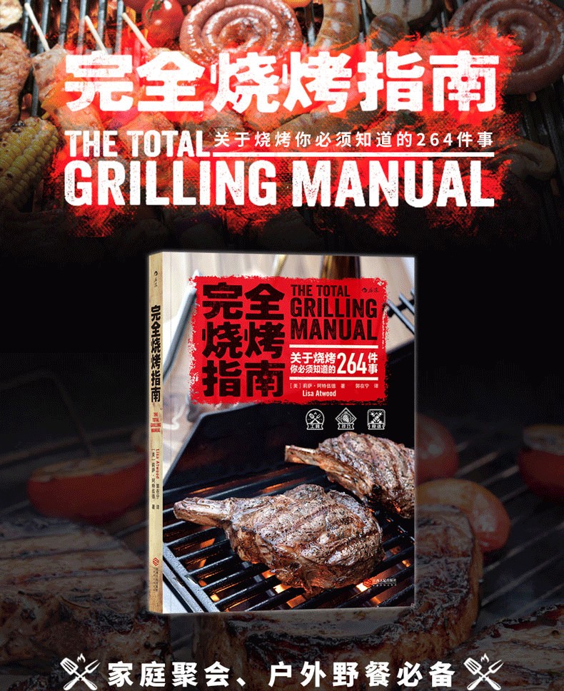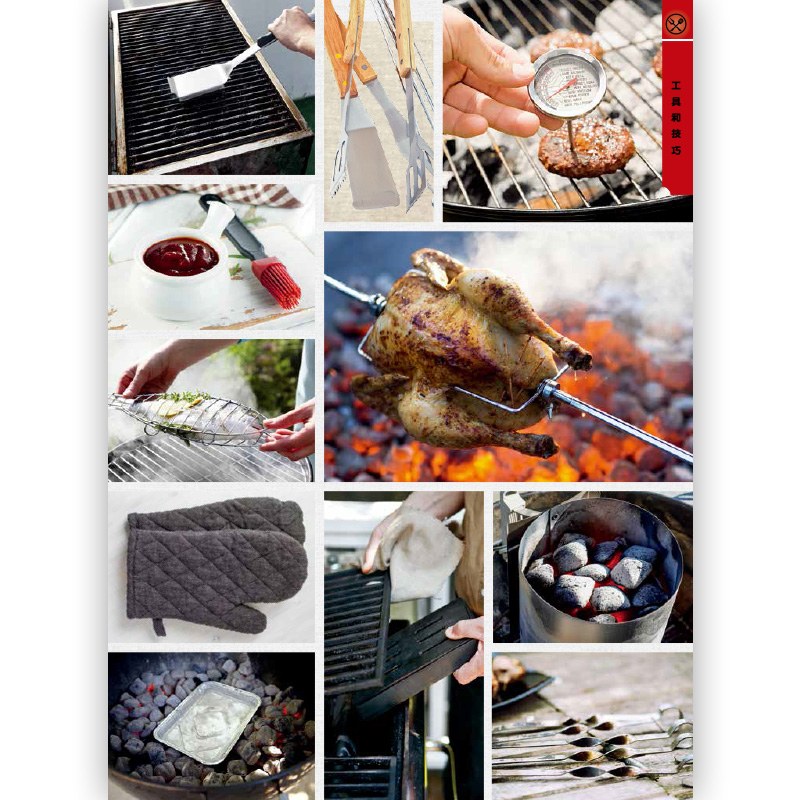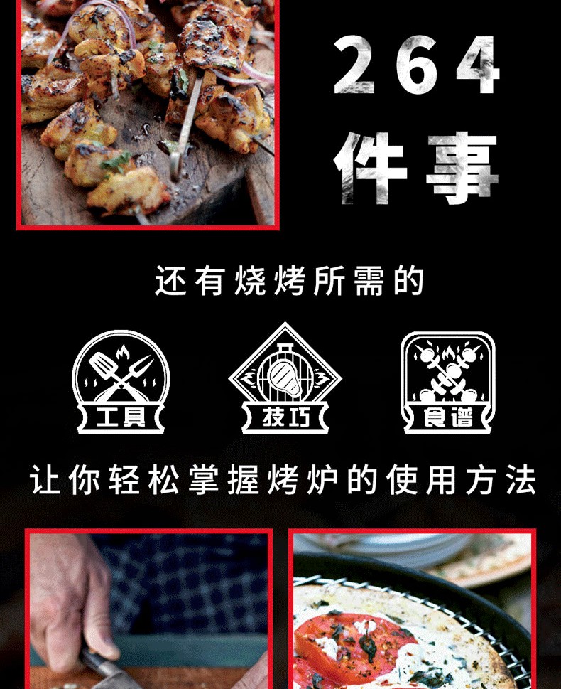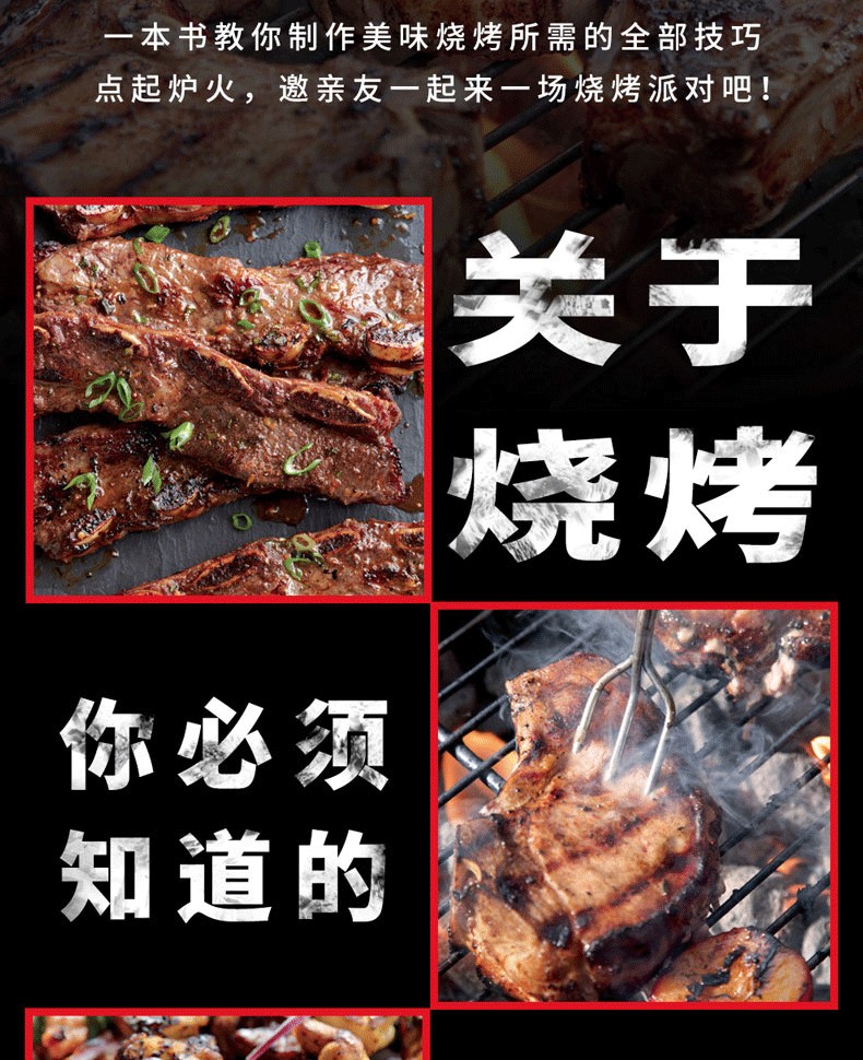 閃烤牛排、茶熏鴨胸肉、烤肉比薩、棉花糖蛋糕的食譜都能在這本書中找到。章節按照牛肉、豬肉、羊肉、家禽、海鮮分類,配以全面的工具和技巧介紹,比如揉搓、醃製、調味等方法,並輔以配菜和飲品的搭配建議。