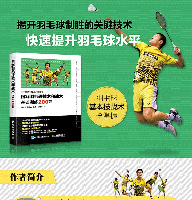 舛田圭太主編的《圖解羽毛球技術和戰術(基礎訓練200項)》是羽毛球基本技術和戰術的訓練攻略,全書包括針對羽毛球基本技術、殺球、高遠球·吊球、網前球、接發球、平抽球、發球、單打的戰術訓練、雙打的戰術訓練、多球訓練、體能訓練等200項基礎訓練項目,以及羽毛球訓練計劃的製訂方法;每項訓練又涵蓋目標、等級、練習步驟、教練筆記、動作要領及建議等內容,並以真人實拍照片、示意圖形式細緻講解每項訓練內容和訓練方法。本書適合從小學生到國家隊選手的所有羽毛球運動員和愛好者夯實羽毛球基本功,並有效提高他們的羽毛球技戰術水平。
