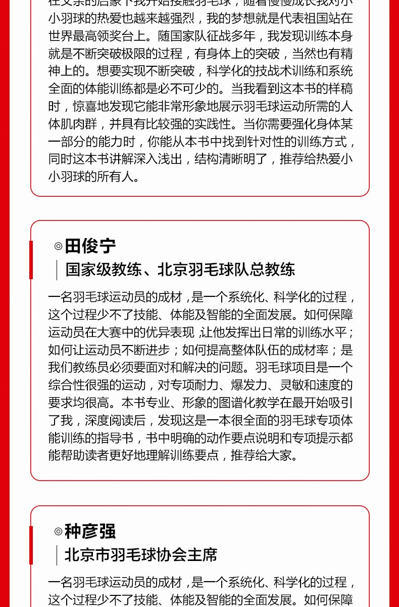 張 楠 羽毛球奧運冠軍、大滿貫獲得者 劉雨辰 羽毛球世錦賽冠軍 田俊寧 重量教練、北京羽毛球隊總教練 種彥強 北京市羽毛球協會主席 專業推薦!北京羽毛球隊男隊教練聯合專業院校老師傾力打造!近500幅真人示範與肌肉解剖彩圖 精講68項與羽毛球技術緊密結合的身體訓練動作 隨書附贈動作教學視頻!結合動作指導視頻學習,輕鬆提高運動表現!