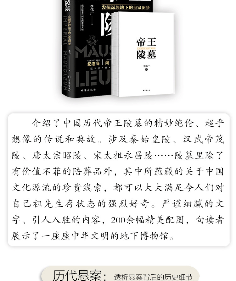 帝王陵墓通過嚴謹細膩的文字、引人入勝的內容配合精美配圖,向讀者展示著中華文明的成長與發展軌跡。無論從建築和裝飾技藝上看,還是從數量、規模來看,各代王朝的陵墓座座都值得後人探索和研究。因為陵墓裡除了有價值不菲的陪葬品外,其中所蘊藏的關於中國文化源流的珍貴線索,都可以大大滿足今人們對自己祖先生存狀態的強烈好奇。要知道,無論哪個人,當他看到那些精妙絕倫、超乎想像的古文化的時候,心中肯定會油然升起一股對自己祖先的崇敬和自豪之情。這些帝陵好像是一座座中華文明的博物館,有著無與倫比的文化價值。