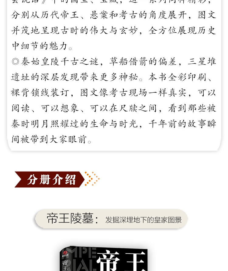 2.和同系列的上一輯涵蓋央視紀錄片《如果國寶會說話》中的國寶、寶藏,這一系列同樣精彩,分別從歷代帝王、懸案和考古的角度展開,圖文並茂地呈現古時的偉大與玄妙,全方位展現歷史中細節的魅力。