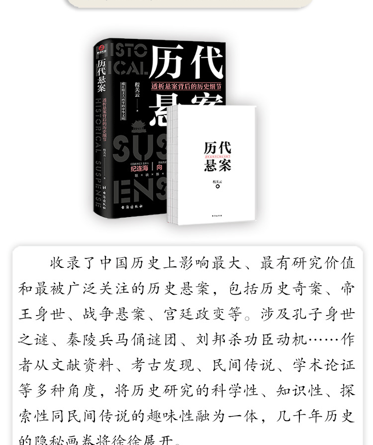歷代懸案收錄了中國歷史上影響*有研究價值和*被廣泛關注的歷史懸案,內容涉及歷史奇案、帝王身世、戰爭懸案、宮廷政變等。作者從文獻資料、考古發現、民間傳說、學術論證等多種角度,全面詳細地探討懸案的來龍去脈,科學嚴謹地分析其成因,深入淺出地解讀歷史,力爭給讀者提供有關懸案*權威、*豐富、*全面的信息。並力圖將歷史研究的科學性、知識性、探索性同民間傳說的趣味性融為一體,充分匯集關於歷史懸疑的各種說法。