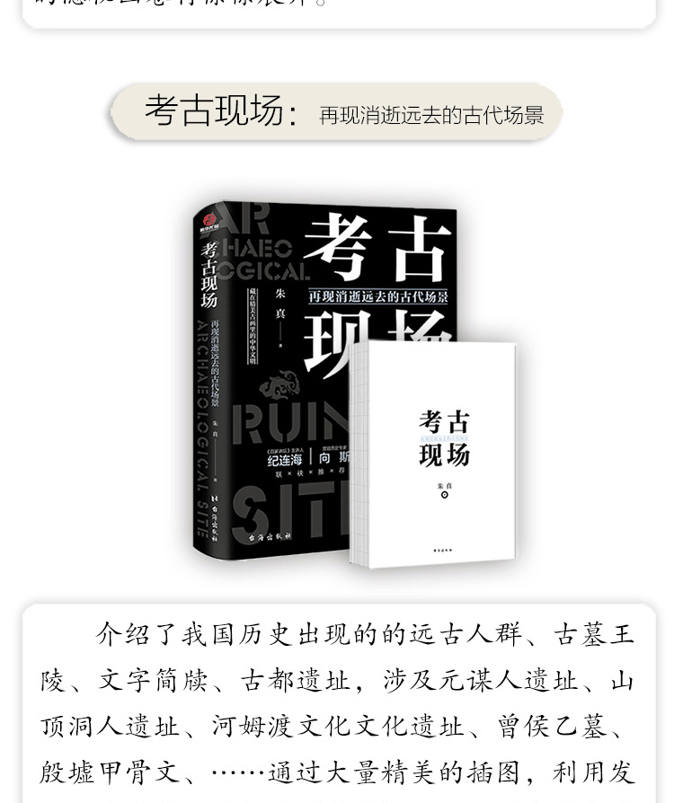 考古現場為考古和歷史愛好者,利用發現歷史的*手方法“考古”通過四個章節分別介紹了我國歷史中國出現的的人類種族、古墓王陵、文字簡牘、古都遺址。本書旨在幫助讀者了解我國考古所取得成就的基本全貌,為此特選取了一些意義重大、深具代表性的考古發現,並詳細地講述了它們的發掘起因、發掘過程、發掘收穫以及發掘的意義與影響。通過大量精美的真圖,展現出歷史的發現者們的*視角,給讀者身臨其境的感覺,更有效,有趣地了解歷史的來龍去脈,並建立起我國不同時代,不同地域的前世今生。