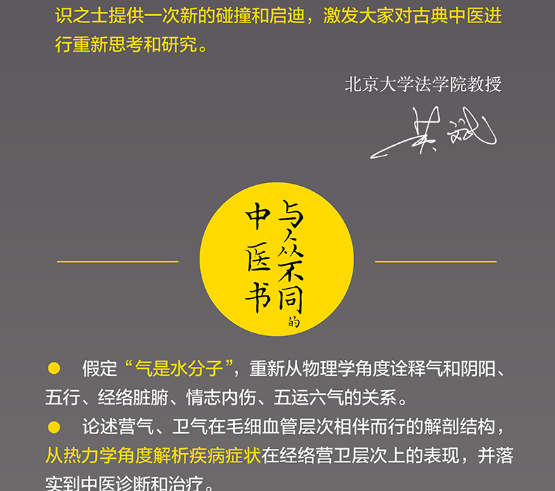 本書提出中醫的核心基礎為氣,並創建氣的建模假設,從而推導出中醫通過治氣來治病的具體方法。將抽象的中醫理論以簡單形象的模型來展示,演示出了中醫的病因、病機理論,以及中醫治病的方法。同時,將健康的觀念傳遞給讀者,告訴大家不要亂用藥,調整自己的身體狀態,改善自己的體質,將疾病防患於未然,才是健康的根本。