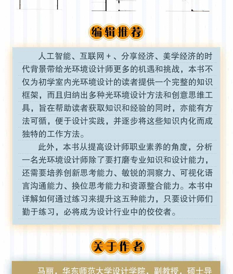 這是一部寫給設計師看的專業燈光設計手冊。在室內設計中,燈光的設計越來越為設計師們所重視,本書將詳細介紹如何為不同的家居設計提的燈光搭配,從光學原理到燈光技術的方方面面,從燈具的挑選到各區域燈光設計的展示,這些區括前門、過道及樓梯空間、客廳空間、廚房空間、餐廳空間、兒童房空間、衛生間、臥室空間、家庭工作間、休閒空間和半開放及外部空間,通過大量而實用的案例,為大家詳盡展現室內設計中燈光設計的手法與在不能空間的照明應用技巧。