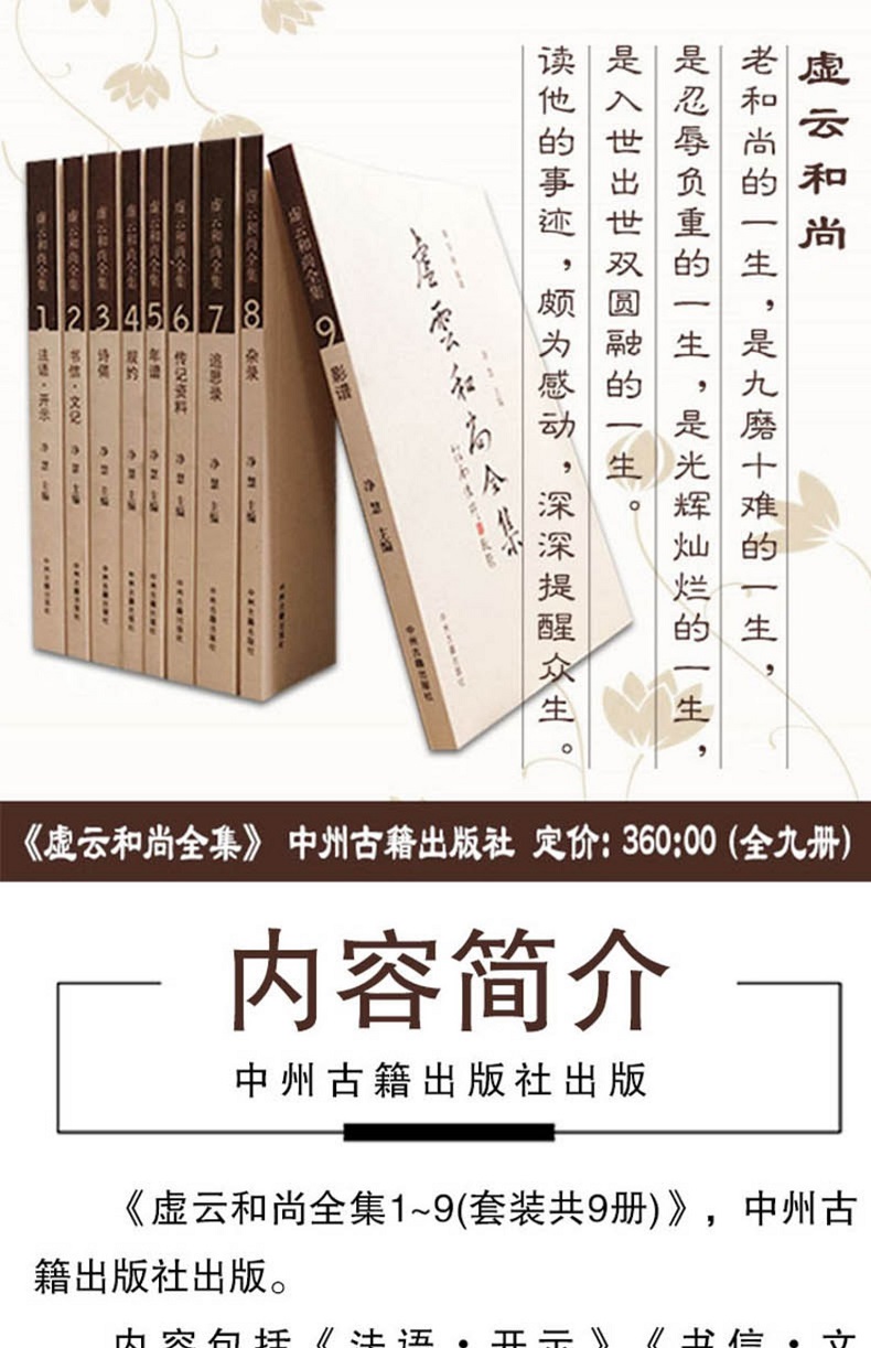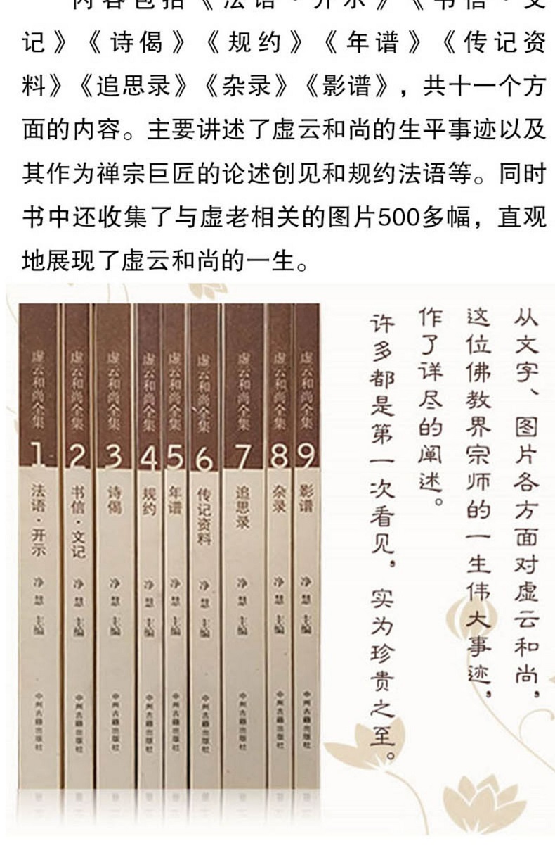 《影譜》部分則收錄了與虛雲和尚有關的圖片資料近五百張。為了整合這些資料,我們參照虛雲和尚的生平,將全部圖片資料分成參學時期、雲南時期、福建時期、廣東時期、江西時期、文字墨跡、舍利遺物、無盡追思等八大類,按時間地點的先後順序進行了系統編排,並附以相應的簡短的文字說明。讀者可以透過這些圖片及相應的文字說明,對虛雲和尚的一生有一個基本的直觀的了解。它可以與純文字的《年譜》起到相輔相成的作用。