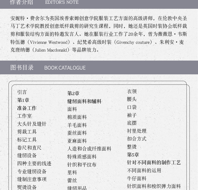 安妮特·費舍爾為英國埃普索姆創意學院服裝工藝方面的高級講師,在倫敦中央聖馬丁藝術學院教授創意紙樣裁剪的研究生課程,同時,她還是英國時裝協會紙樣裁剪和服裝結構方面的特邀發言人。她在服裝行業工作了20餘年,曾為薇薇恩·韋斯特伍德(Vivienne Westwood)、紀梵希高級時裝(Givenchy couture)、朱利安·麥克唐納德(Julien Macdonald)等品牌效力。