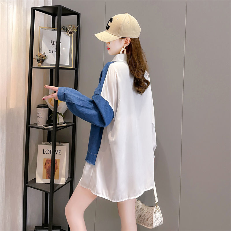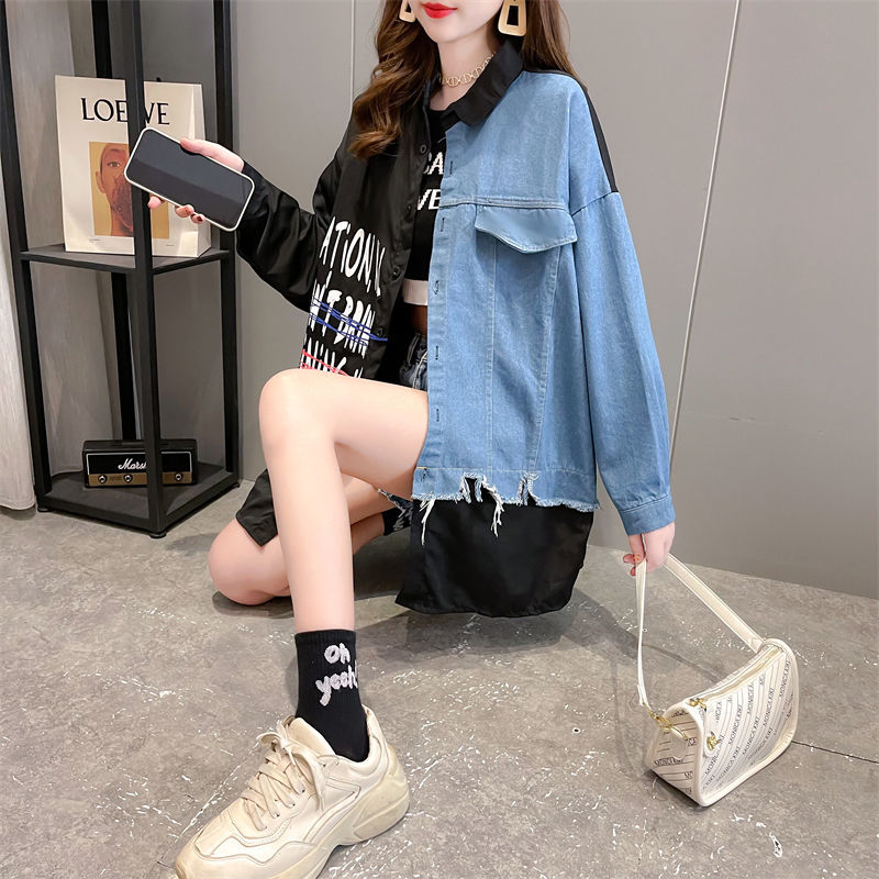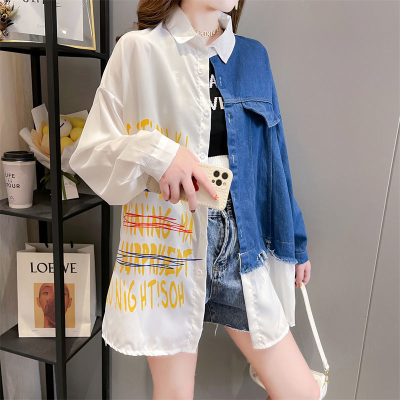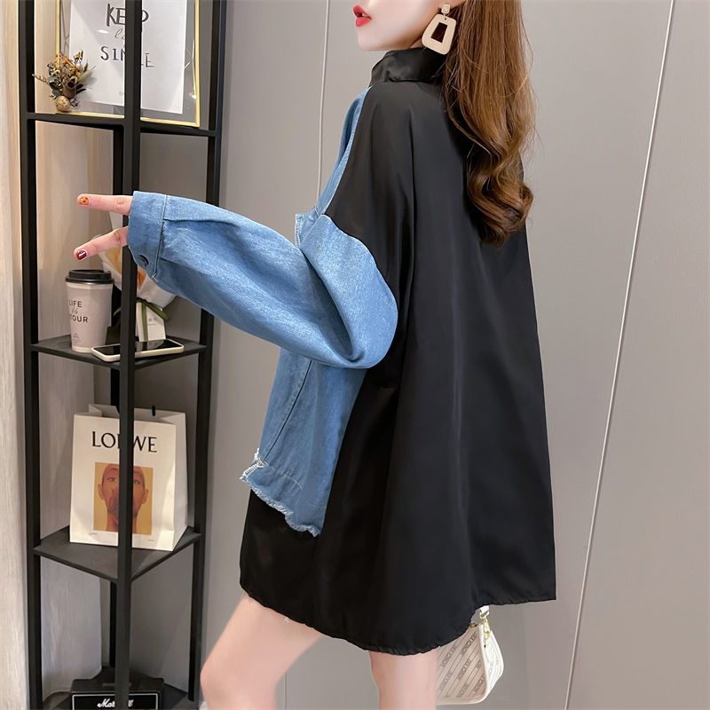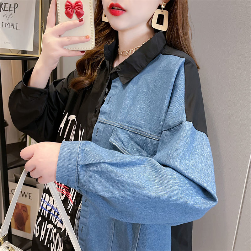 韓版設計感牛仔拼接薄款襯衫 新款寬鬆大碼女裝上衣