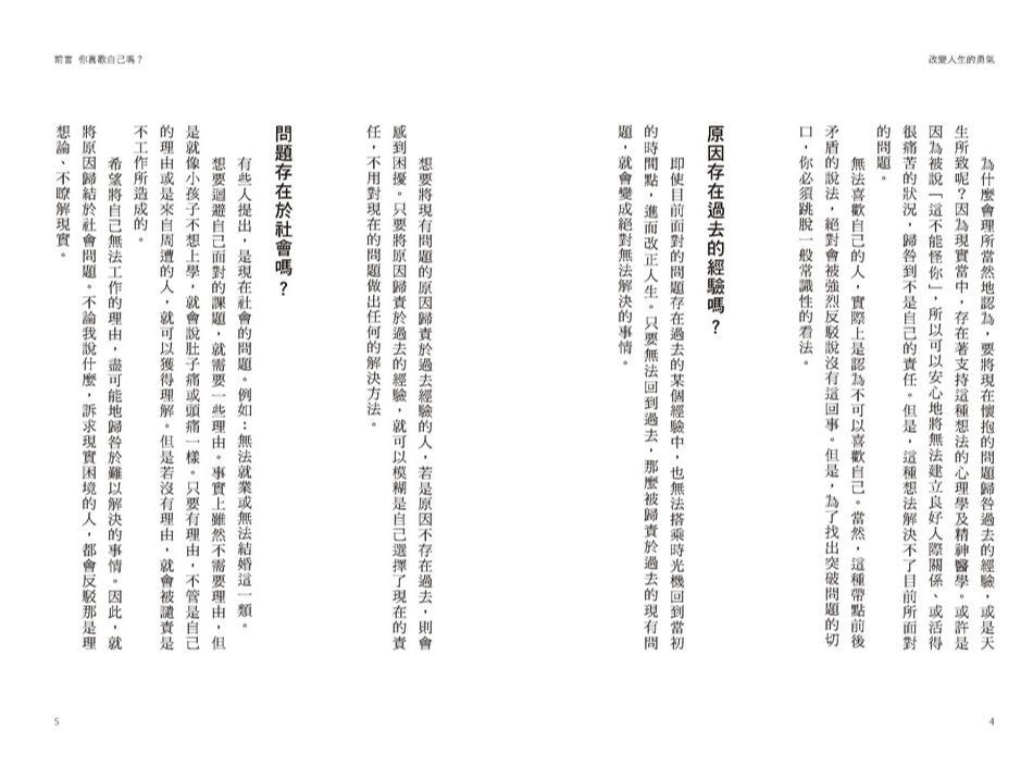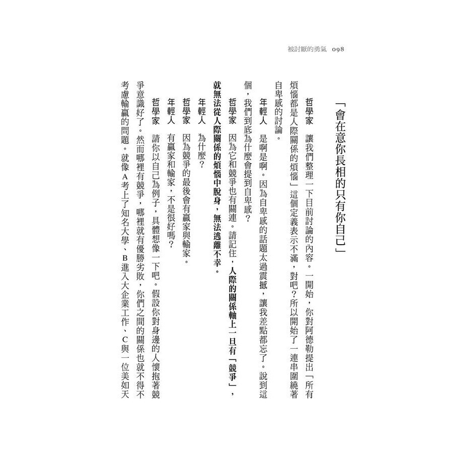 為什麼討厭自己? /所有煩惱都是「人際關係的煩惱」/自卑感,是一種主觀的認定/當成藉口的自卑情結/自傲的人,同時也感到自卑/人生並不是與他人的競賽/「會在意你長相的只有你自己」/從權力鬥爭到復仇/認錯不等於「承認失敗」/如何跨越迎面而來的「人生任務」/紅線與頑強的鎖鏈/不要漠視「人生的謊言」/從擁有的心理學到使用的心理學