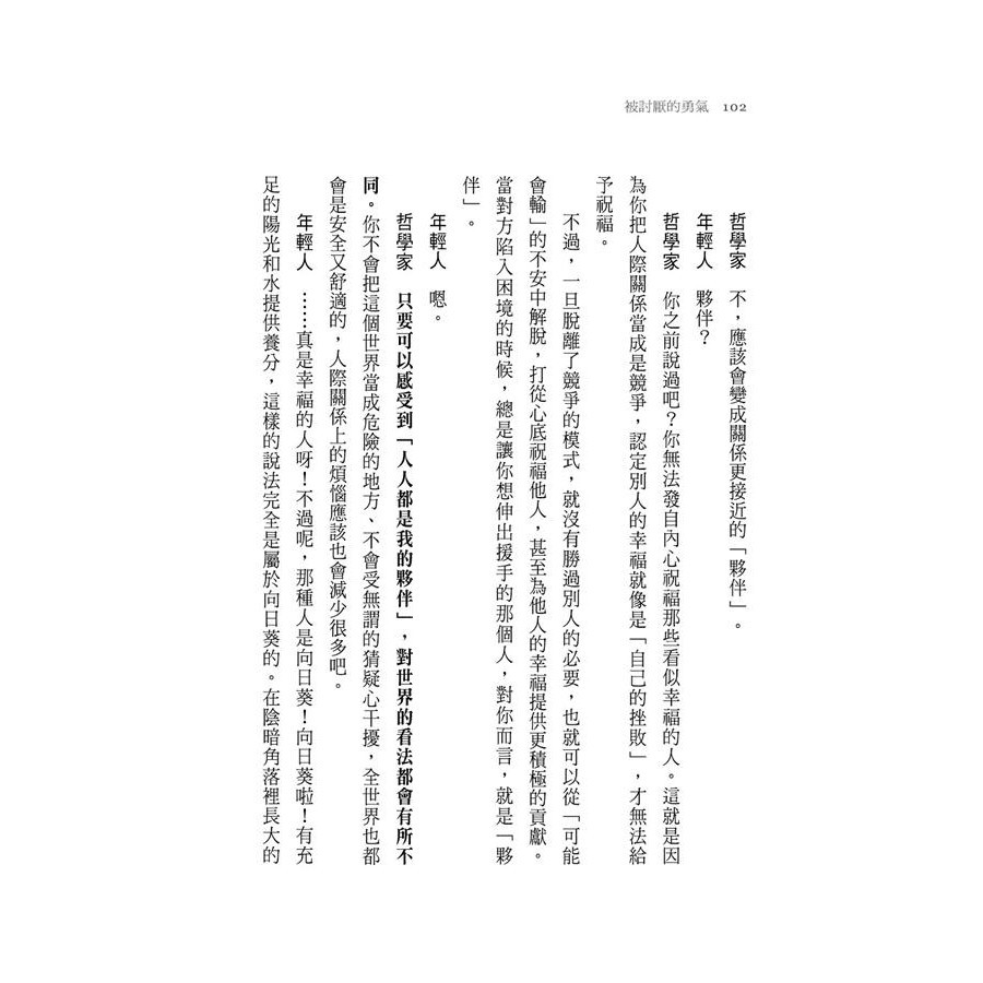 ◆在內容上,本書對於前作《被討厭的勇氣》中所提到的阿德勒心理學重點之一──人生任務和社會意識有更深的探討,對於工作的目的,也讓我豁然開朗,不但很合理,更讓我對工作的態度有了改變。