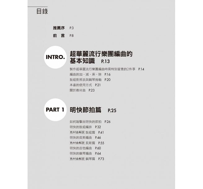 目錄 推薦序 前言INTRO. 超華麗流行樂團編曲的基本知識 製作超華麗流行樂團編曲時需特別留意的2件事 編曲的加-減-乘-除 鼓組對照表與鋼琴捲軸(piano roll) 本書的使用方式 關於教材曲PART 1 明快節拍篇 如何敲擊出明快的節拍 明快的鼓組編排 教材曲解說 鼓組篇 明快的貝斯編曲 教材曲解說 貝斯篇 明快的吉他編曲 明快的鋼琴編曲 教材曲解說 鋼琴篇PART 2 可哼唱樂句篇 可哼唱樂句的散布方式 節奏-動向-聲音的使用方式 樂句展現處 間隙樂句的攻略 吉他和鋼琴在演奏、編曲上的差異 背景樂句的攻略 教材曲解說 樂句分析篇 鼓組過門 教材曲解說 鼓組過門篇PART 3 流行樂團合奏篇 合奏的彙整方式 透過綜效提高華麗感 教材曲解說 綜效篇 清楚確立優先性