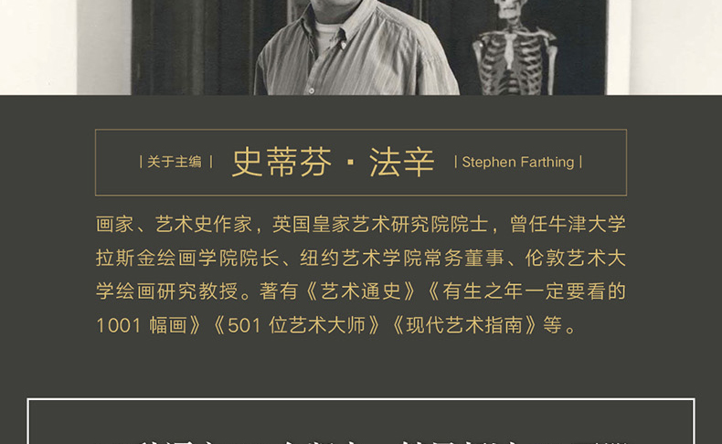 史蒂芬·法辛(Stephen Farthing),英國畫家、藝術史作家,英國皇家藝術研究院院士。自1977年開始,一直從事美術教育工作,曾任牛津大學拉斯金繪畫學院院長、紐約藝術學院常務董事、倫敦藝術大學繪畫研究教授等。著有《藝術通史》《有生之年一定要看的1001幅畫》《501位藝術大師》《現代藝術指南》等。