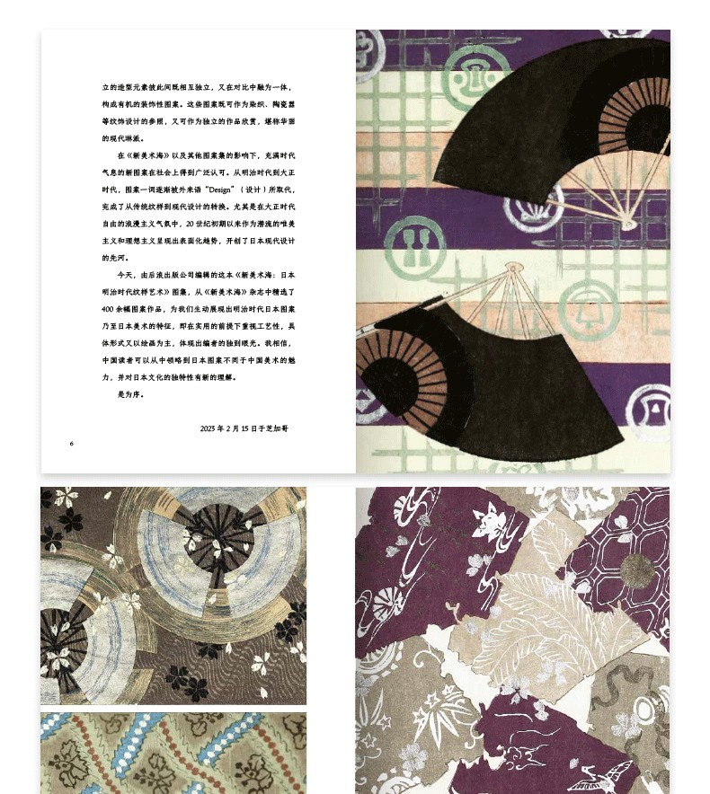 《新美術海》是開創日本現代設計先河的圖案設計精選,東方琳派與西方新藝術運動的完美融合。其中收錄的圖案多以花鳥風月、四季景色為主題,是自然之美和設計之美的結合。這些紋樣配色生動且有生命力,構圖也頗具巧思,作品雖為20世紀初所作,即使在一百多年後的今天,仍然能給人以啟發。