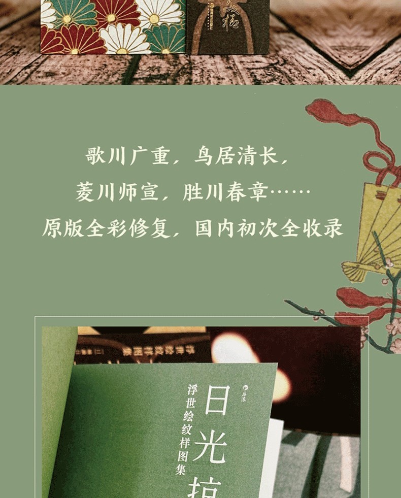《日光掠影:浮世繪圖樣圖集》集結近50位浮世繪畫師的240幅紋樣設計標誌性圖案。自浮世繪初現至成熟期,橫貫近300年,從海量之作中精挑細選,包括版畫、繪本或肉筆作品,展現日本畫師豐盈的藝術想像力。除了耳熟能詳的歌川廣重、鳥居清長,還有宮川畫派鼻祖宮川長春,川又派鼻祖川又常行,勝川派創始人勝川春章,「役者繪巨擘」東洲齋寫樂,等等,更是收羅不少創作者不詳的稀有之作。一本書即可賞玩浮世繪紋樣本身的優雅艷麗、美妙細節,讀者可以一幅一幅地鑑賞圖案的配色、佈局、構想。