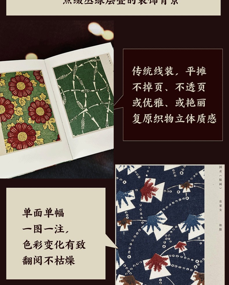 內文傳統線裝,180°平攤不掉頁、不透頁,或優雅、或艷麗,復原織物立體質感