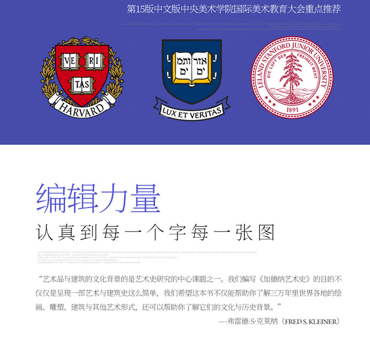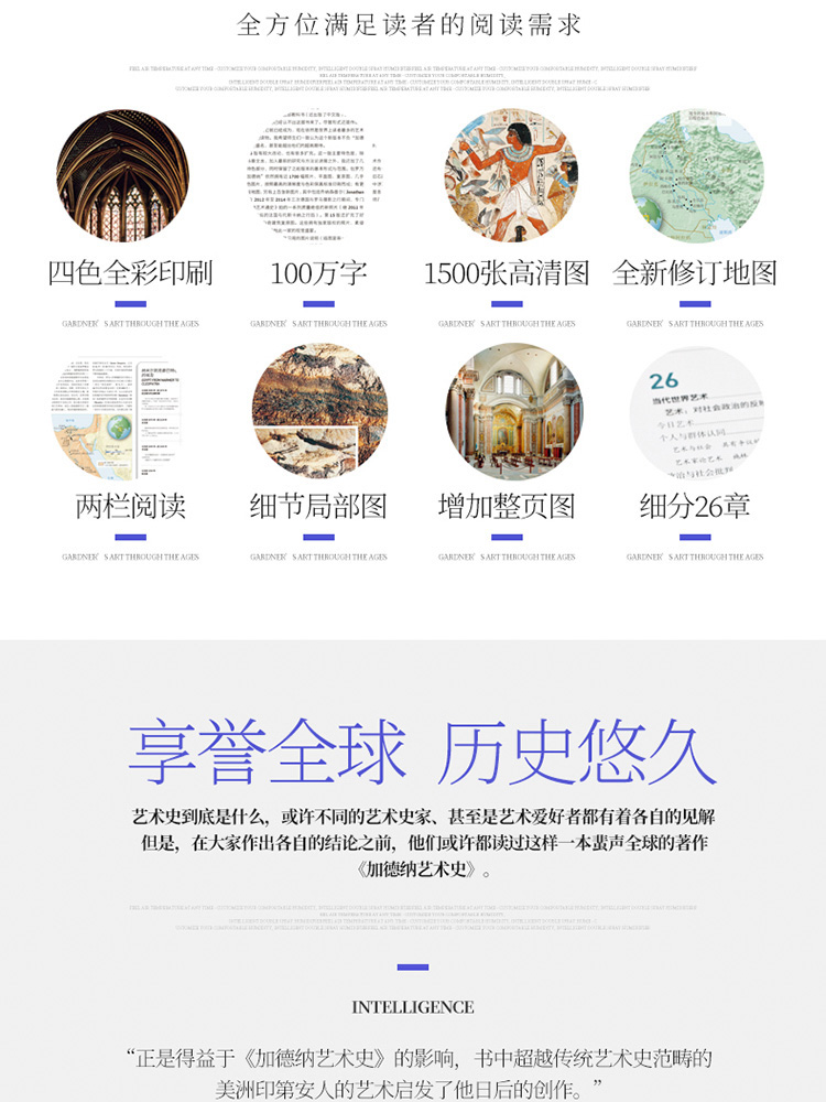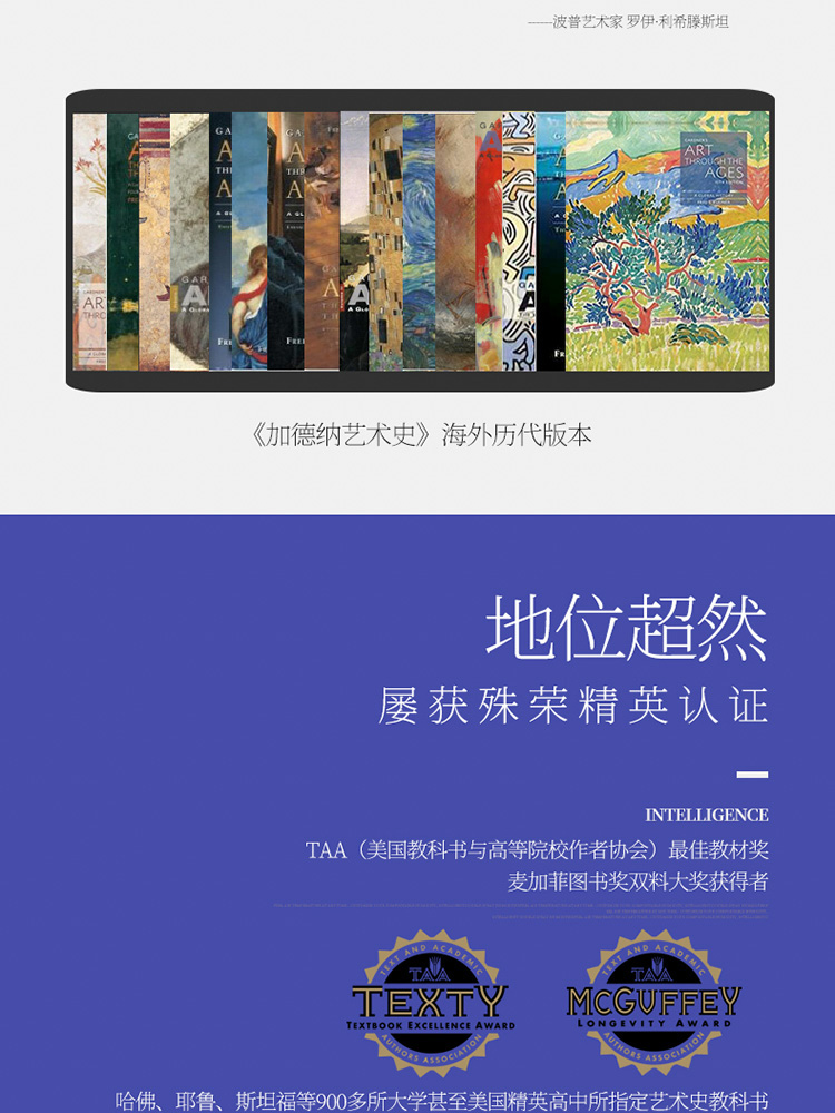 本書是以西方藝術史為主線的《加德納藝術史》的經典版,包括了西方史前藝術、古希臘羅馬藝術、中世紀藝術、文藝復興藝術、巴羅克與洛可哥藝術、18世紀藝術、19世紀藝術、現代藝術與當代藝術等內容。本藝術史關注藝術的歷史與文化背景,注重普及性與趣味性,力求明白易懂,致力為更廣大藝術愛好者開啟藝術聖殿之門。