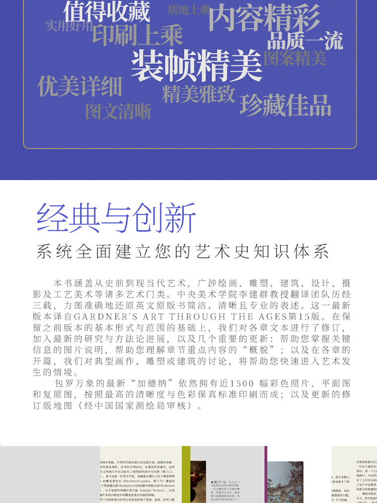 《加德納藝術史》經典版譯自世界知名藝術史 Gardner’s Art Through the Ages 第15版。本書自海倫 加德納1926年首次出版以來,一直廣受好評,不斷再版,堪稱讀者多、流傳廣的藝術通史;本書先後被哈佛、耶魯等著名大學甚至美國精英高中選為教材。本書遵循加德納的基本框架,以“全景化”視角展示藝術發展美的歷程。全書共38章,近125萬字,收錄近1700張高清圖片;涵蓋從史前到現當代藝術,廣涉繪畫、雕塑、建築、設計、攝影及工藝美術等諸多藝術門類。