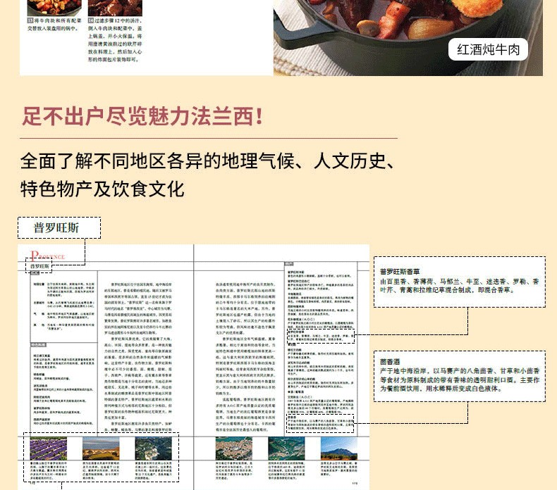 本書依據行政和美食區劃,將法國劃分為22個地區,書中詳細介紹了不同地區的地理氣候、人文歷史、特色物產及飲食文化,並選取了每個地區代表性的共83道特色料理,分步詳解製作方法。還包括底湯、醬汁、面坯、配菜的做法和肉類、蔬菜、海鮮的預處理等基礎烹飪技法。讀者通過本書能夠全面了解法國不同地區的風土人情和地道特色料理。