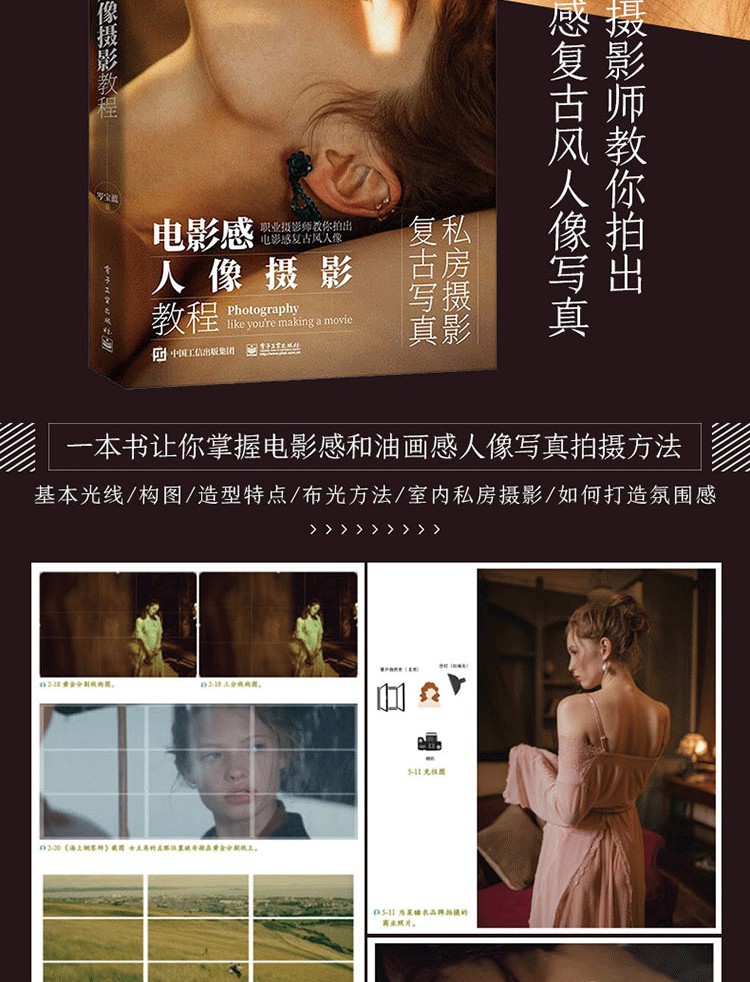 本書重點講解作者擅長的以復古、浪漫、優雅為基調,別具一格的油畫感和電影感人像的拍攝方法。內容包括電影感人像的基本光線、構圖、造型特點,如何打造氛圍感,還有大量案例分別講解不同類型(英倫復古電影風格、香港電影風格、中式電影風格等)的電影元素要如何轉化成攝影作品,並打造自己獨特的風格。本書旨在教會那些想為別人,或者想為自己紀錄下美,拍出具有藝術性的私房寫真。
