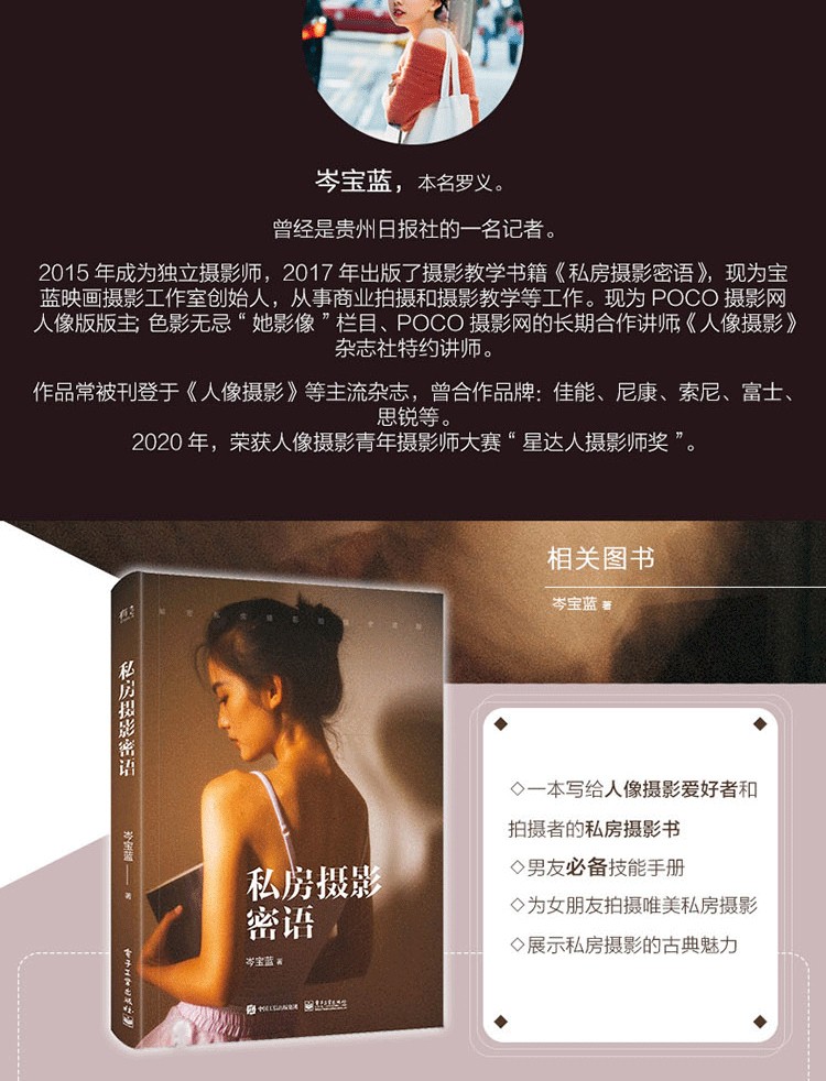 "※資深私房攝影師岑寶藍繼暢銷圖書《私房攝影密語》之後的全新力作 ※全彩印刷,無光銅紙張,近300頁超多乾貨內容 ※私房攝影、日系寫真、歐美人像,各種風格一網打盡 "