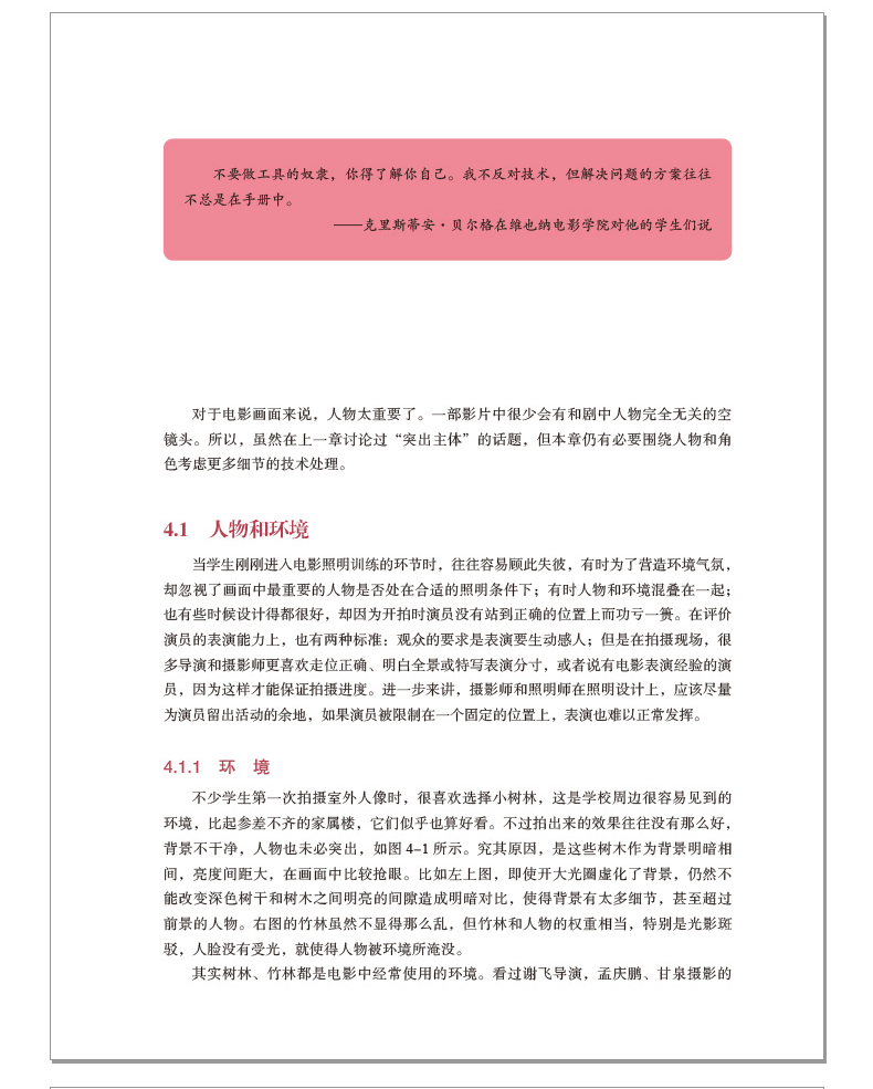 這是一本值得精讀的實用攝影教材,旨在幫助影像創作者完成從業餘到專業的跨越,建立光影造型思維。業餘和專業的區別不在於設備,而在於技術和審美。想要駕馭影像,需深入理解畫面的影調、色彩和細部再現對整體造型的影響。本書圍繞畫質控制,從人物、外景、內景實景和攝影棚幾個方面,搭配上百部片例,細緻剖析技術細節的表現力,對新手常見問題提出改進建議,比如怎樣讓畫面乾淨、合理、情緒到位,有效服務於敘事,提升觀眾的沉浸體驗。一旦掌握要訣,即使你用手機拍攝,照樣能拍得“電影感”十足。