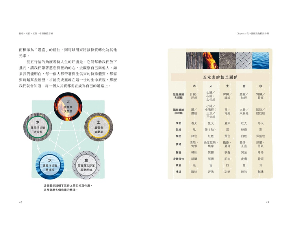 ,並以這些精油調配出改善症狀的配方。每支精油都會有中醫理論的解析,像是對應哪些經絡、哪些五行與氣的層級,適合搭配哪些精油等等。