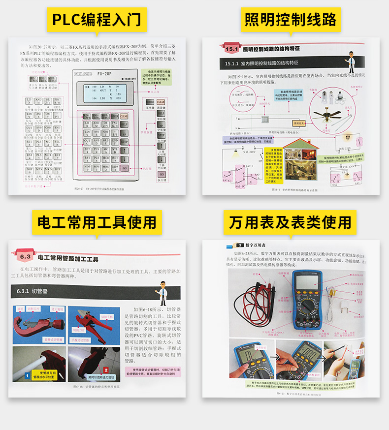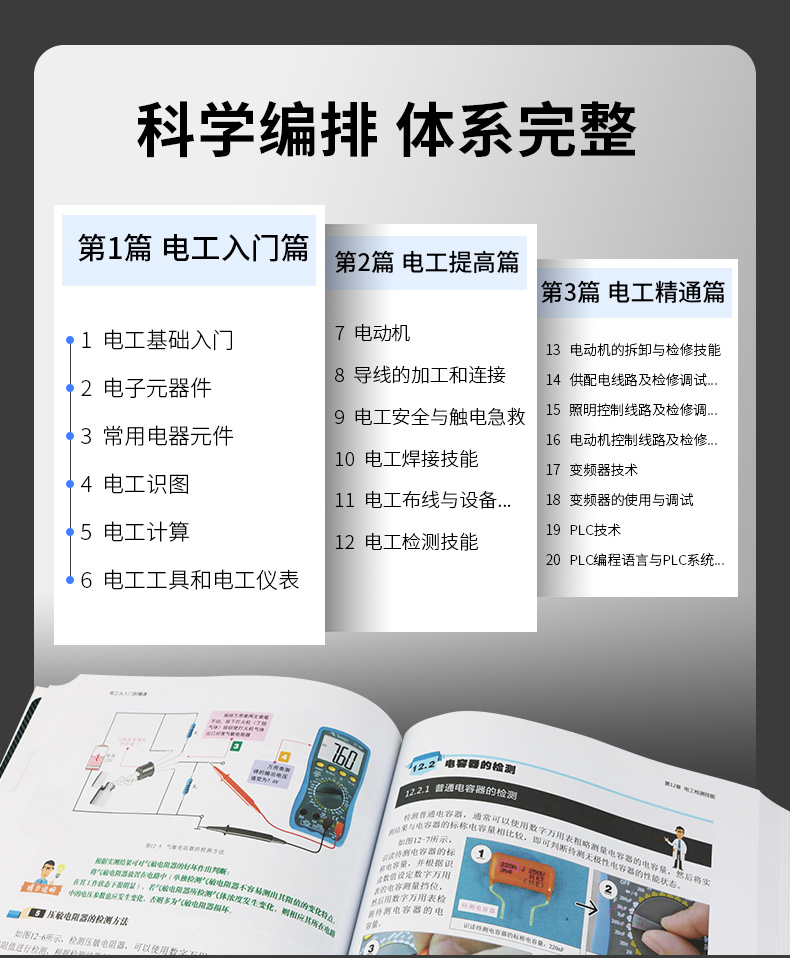 本書內容包括:電工基礎入門、電子元器件、常用電器元件、電工識圖、電工計算、電工工具和電工儀表、電動機、導線的加工和連接、電工安全與觸電急救、電工焊接技能、電工佈線與設備安裝技能、電工檢測技能、電動機的拆卸與檢修技能、供配電線路及檢修調試技能、照明控制線路及檢修調試技能、電動機控制線路及檢修調試技能、變頻器技術、變頻器的使用與調試、PLC技術和PLC編程語言與PLC系統的安裝及調試等。