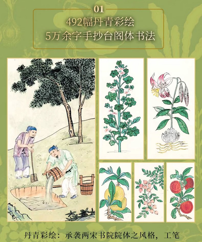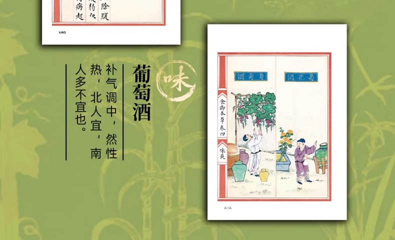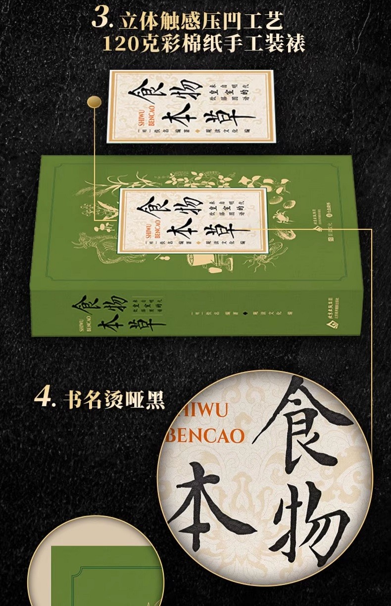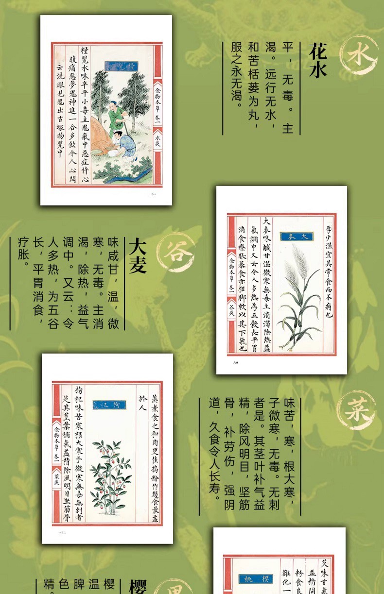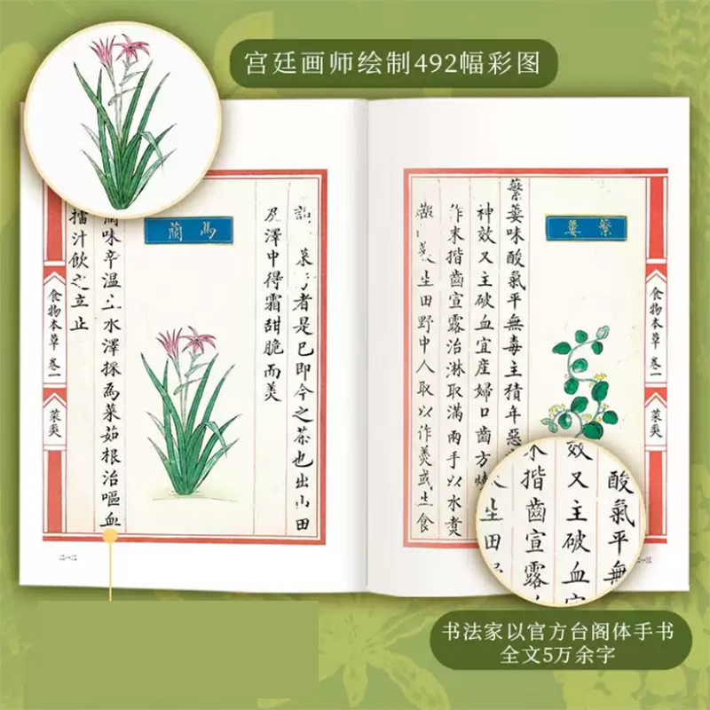 本書涵蓋水、穀、菜、果、禽、獸、魚、味8大類,共492種食物,492幅丹青彩繪,5萬餘字台閣體書法,內容幾乎囊括了中國17世紀以前所有見載於書籍中的食物。除了明代 《食物本草》 明抄彩繪本原本復刻,100張實景圖雲遊本草 + 39首本草詩詞。