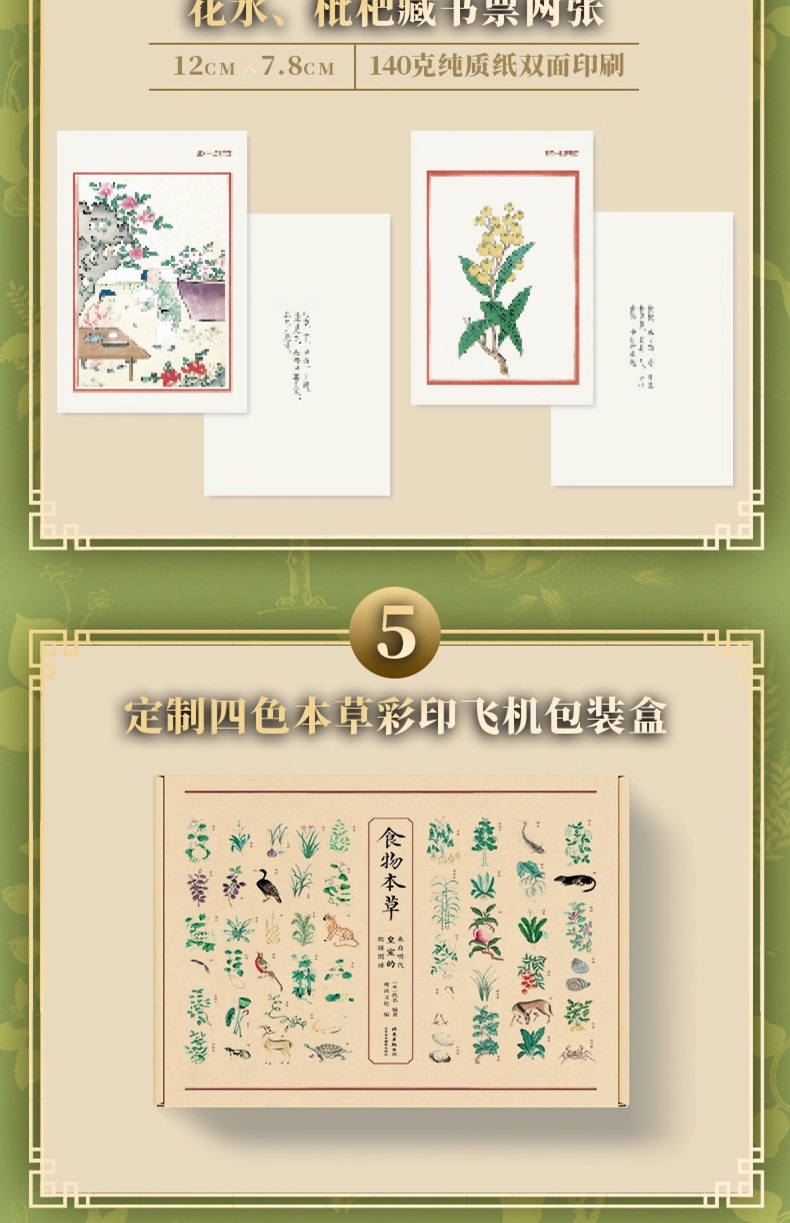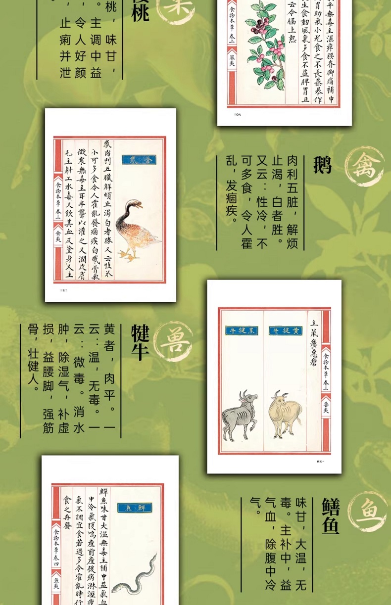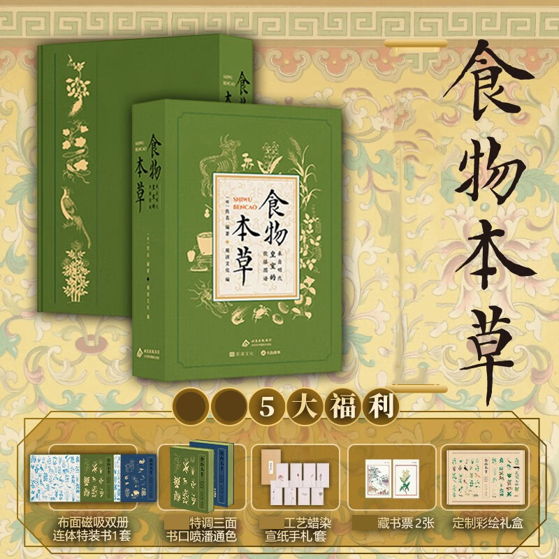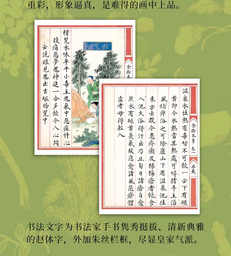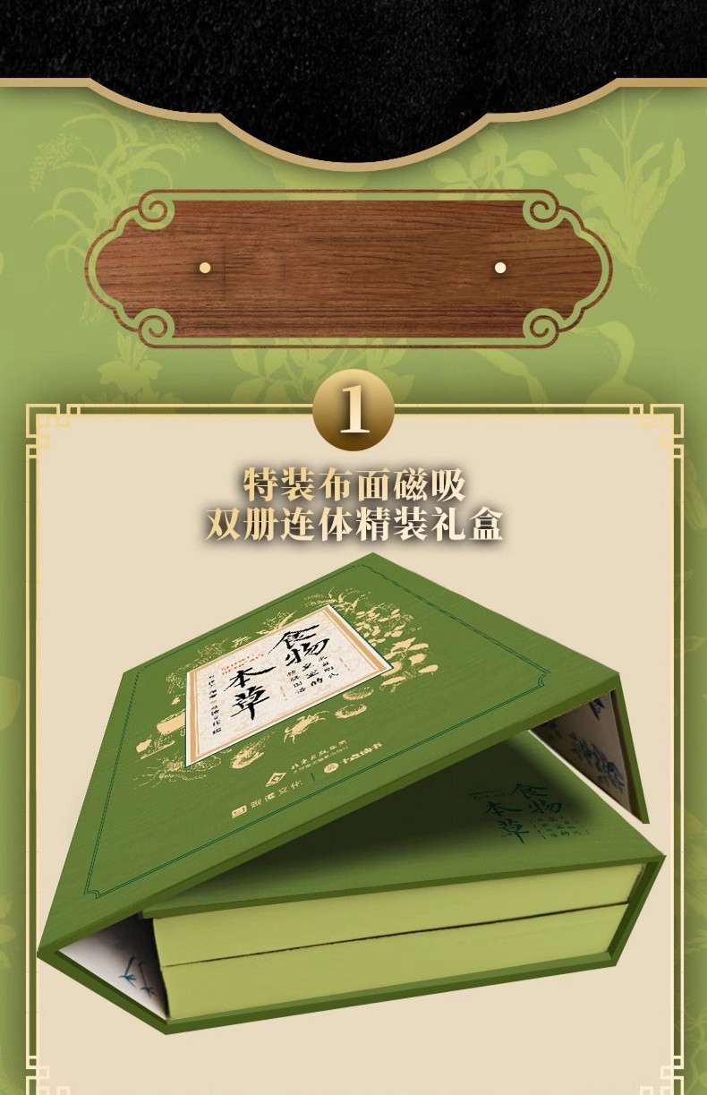 《食物本草》(共2冊) 布面磁吸雙冊連體裝幀,古典雅緻,三面書口噴潘通色 台閣書法壓凹 涵蓋水、穀、菜、果、禽、獸、魚、味8大類,共492種食物,492幅丹青彩繪,5萬餘字台閣體書法 附手紮套+藏書票