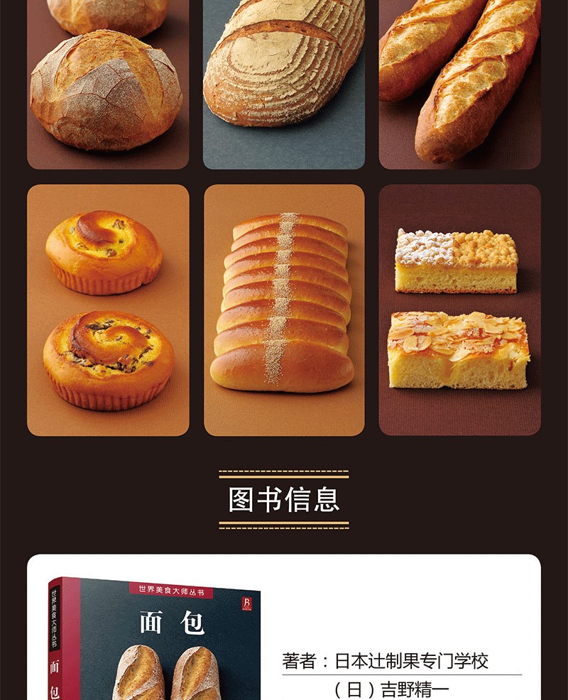 希望吉野精一著,於春佳譯的《麵包/世界美食大師叢書》能夠為各位讀者提供些許的幫助,能夠為從事麵包製作工作的人們以及麵包烘焙愛好者提供些理論和實踐上的指導。