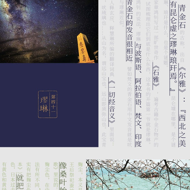 以色彩連接中華文化的方方面面——織染、天象、地理、礦物、植物,不一而足。 “?,帛青經縹緯。一曰育陽染也”,這種經線為靛、緯線為縹的織物織法和顏色與當今牛仔布一樣。 《史記·天官書》講 “辰星之色:春,青黃;夏,赤白;秋,青白;冬,黃而不明”,四時星辰之色竟然有這樣大的不同。