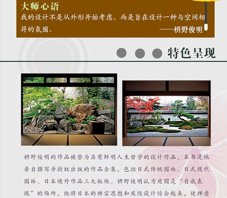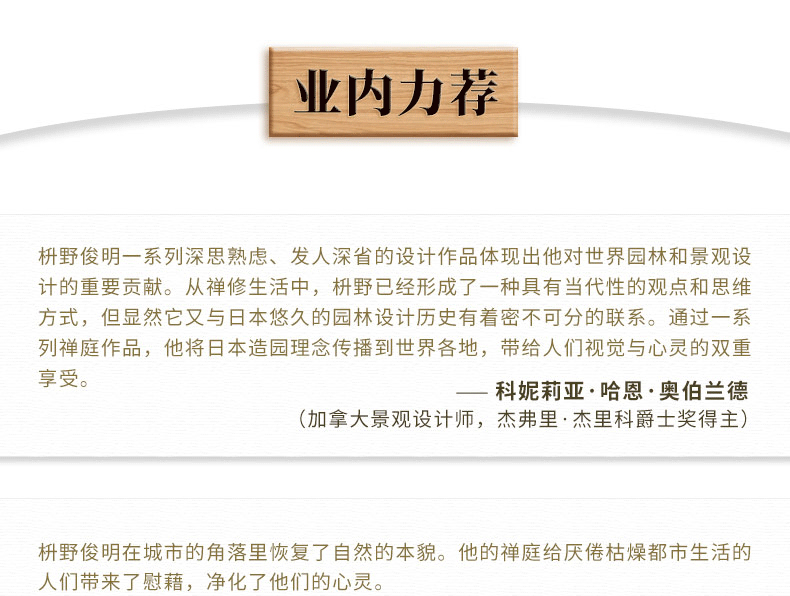 1作者權wei:枡野俊明擁有近40年的景觀設計經驗,在世界各地完成了眾多的設計項目,屢獲大獎。 其作品準確地繼承了日本傳統庭園的精髓,並結合現代的脉络,帶給人們視覺與心靈的雙重享受。