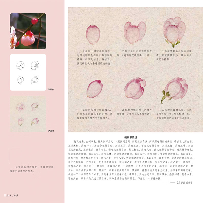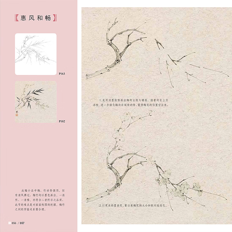 本書是針對國畫初學者所策劃的沒骨畫技法書,全書分為技法講解及教學課稿兩部分。技法講解部分主要分為沒骨技法簡介,梅花各部分的沒骨繪製技法,多幅不同構圖、不同種類的梅花小品的繪製步驟演示。講解著重於用色、技法、造型特點、構圖方式及初學者臨摹學習過程中的難點要點等。教學課稿部分是將技法講解部分所展示的課稿放大,並與技法講解部分一一對應,同時,教學課稿部分做活頁處理,使讀者臨摹、檢索、整理起來更加方便。