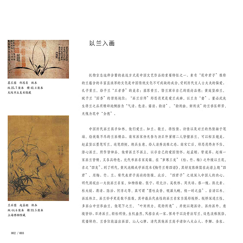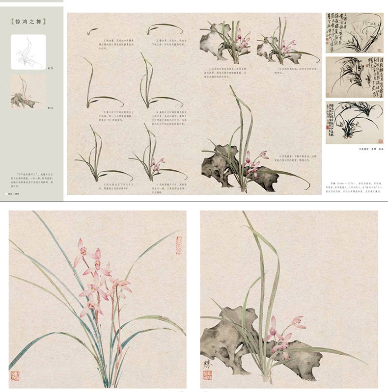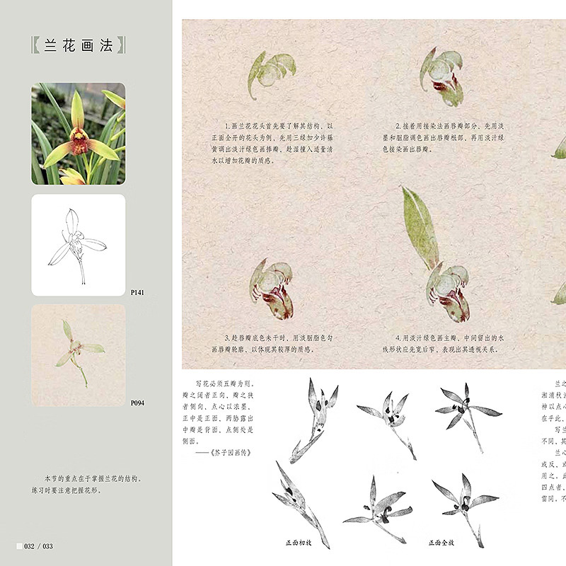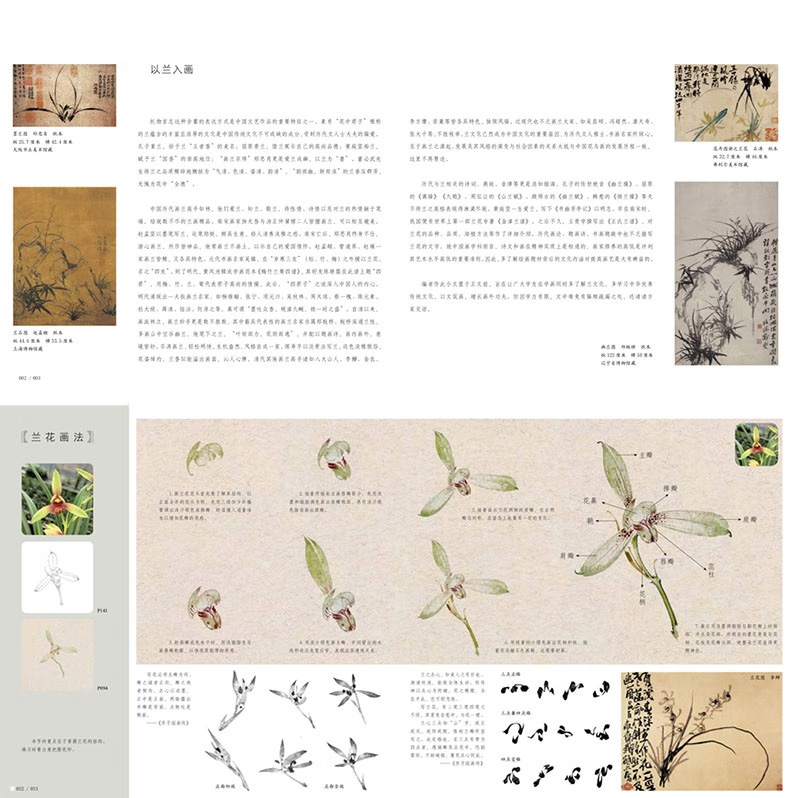 本書是針對國畫初學者所策劃的沒骨畫技法書,全書分為技法講解及教學課稿兩部分。技法講解部分主要分為沒骨技法簡介,蘭花各部分的沒骨繪製技法,多幅不同構圖、不同種類的蘭花小品的繪製步驟演示。講解著重於用色、技法、造型特點、構圖方式及初學者臨摹學習過程中的難點要點等。教學課稿部分是將技法講解部分所展示的課稿放大,並與技法講解部分一一對應,同時,教學課稿部分做活頁處理,使讀者臨摹、檢索、整理起來更加方便。
