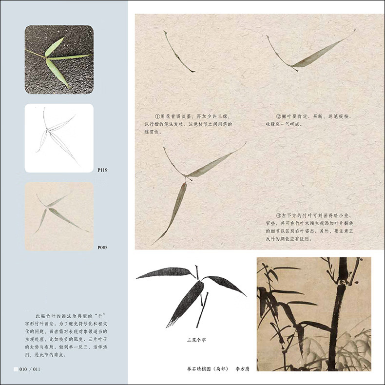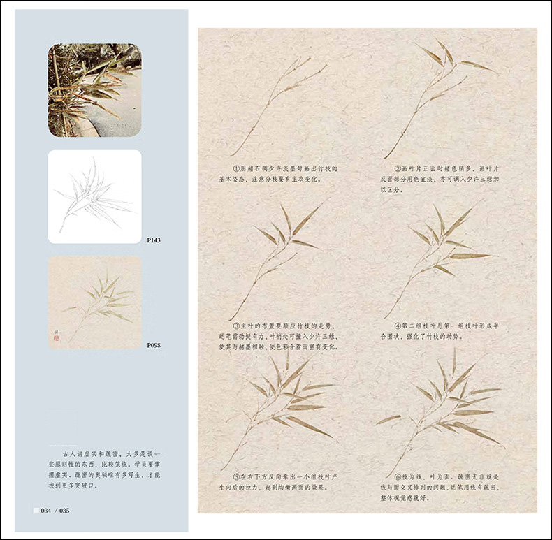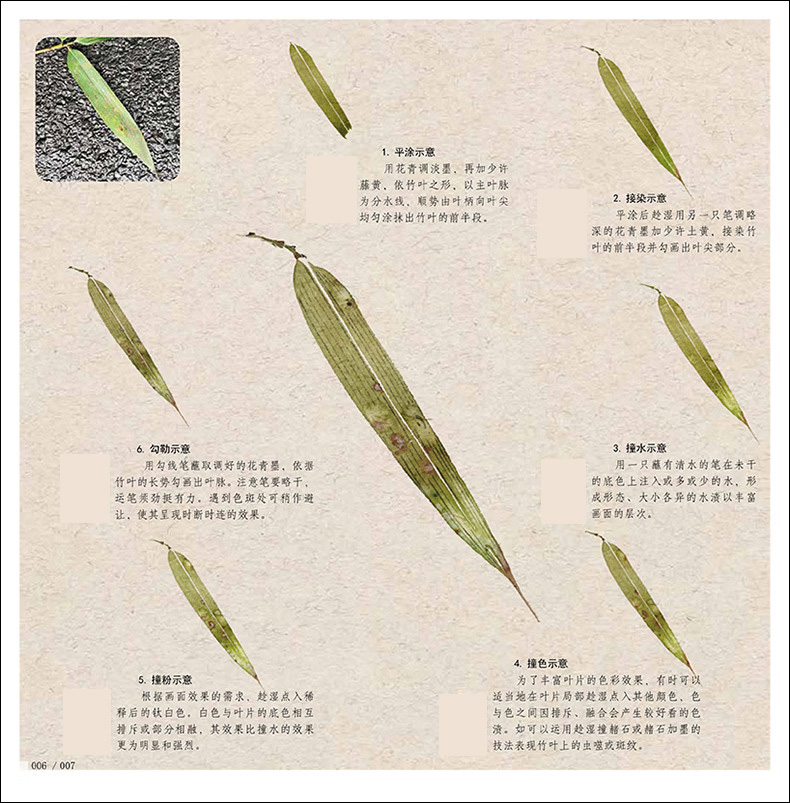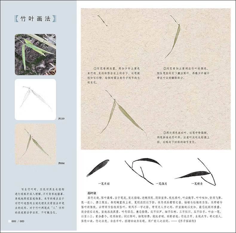 本書是針對國畫初學者所策劃的沒骨畫技法書,全書分為技法講解及教學課稿兩部分。技法講解部分主要分為沒骨技法簡介,竹子各部分的沒骨繪製技法,多幅不同構圖、不同種類的竹子小品的繪製步驟演示。講解著重於用色、技法、造型特點、構圖方式及初學者臨摹學習過程中的難點要點等。教學課稿部分是將技法講解部分所展示的課稿放大,並與技法講解部分一一對應,同時,教學課稿部分做活頁處理,使讀者臨摹、檢索、整理起來更加方便。