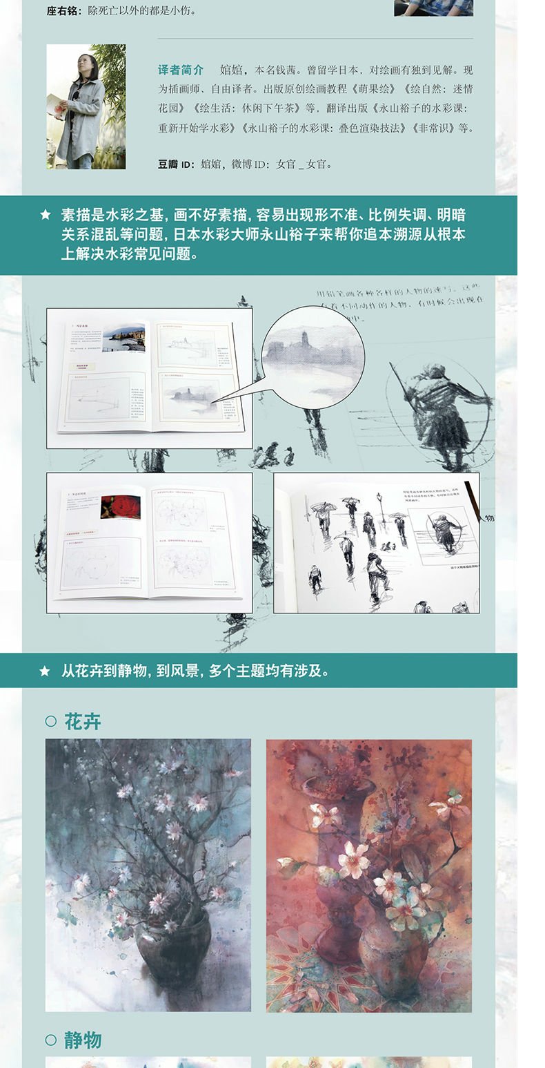 如果你著迷於水彩之美,卻困擾於難於駕馭它;如果你在描繪水彩時,時常面臨手忙腳亂,成品效果不盡如人意,甚至是一團糟的窘境;如果你想在繪畫前便胸有成竹,畫的過程中從容不迫;如果你想收放自如地運用各種技巧,並免於呆板流俗,那麼你需要提升素描能力,並以此為堅實基礎,進階水彩。