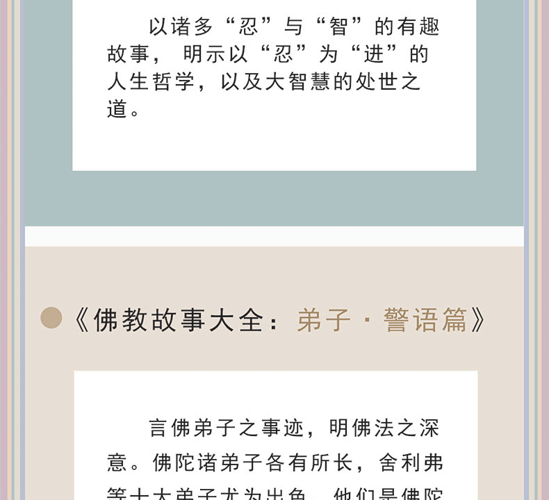 《弟子警語篇》言佛弟子之事蹟,明佛法之深意。佛陀諸弟子各有所長,舍利弗等十大弟子尤為出色,他們是佛陀理念的忠實踐行者。佛經中不乏言簡意賅的警語,它們是諸佛智慧的高度凝結,為眾人打開一扇擁抱佛陀的大門。