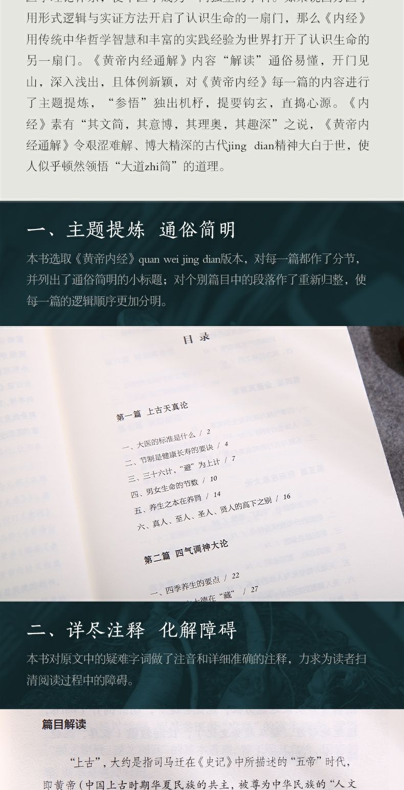 《黃帝內經(以下稱《內經)是現存最早的中醫經典巨著。它從「天地人三才一體」思想出發,從生命的演化過程中把握生命活動規律;不僅從宏觀的角度論證了天地人之間的相互關係,並且運用了古代多學科的理論和方法闡述了醫學科學zui基本的命題——生命規律,從而建立起具有東方文化特色的中醫學理論體系,使中醫學成為一門獨立的學科。如果西方醫學用形式邏輯與實證方法開啟了認識生命的一扇門,那麼《內經用傳統中華哲學智慧和豐富的實踐經驗為世界打開了認識生命的另一扇門。 《黃帝內經通解內容「解讀」通俗易懂,開門見山,深入淺出,且體例新穎,對《黃帝內經每一篇的內容進行了主題提煉,「參悟」獨出機杼,提要鉤玄,直搗心源。 《內經素有「其文簡,其意博,其理奧,其趣深」之說,《黃帝內經通解令艱澀難解、博大精簡的古代精神大白於世,使人似乎頓然領悟「大道zhi簡」的道理。